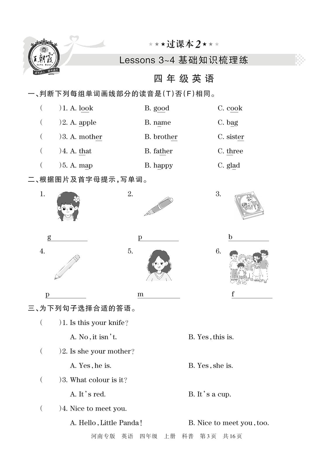 王朝霞期末过课本——Lessons 3~4 基础知识梳理练四年级上册英语(科普版)【2】