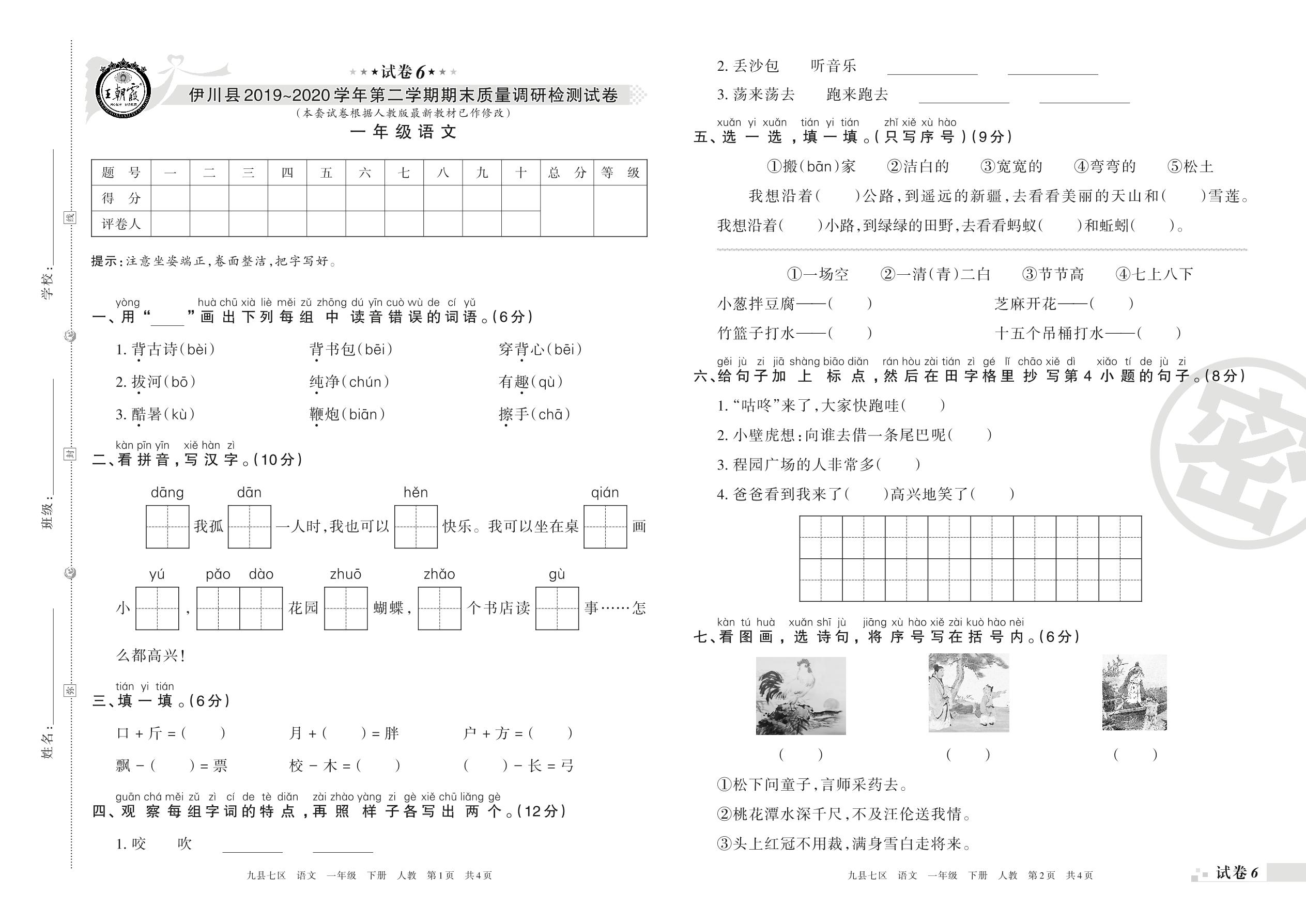 2019-2020学年第二学期洛阳市伊川县一年级语文试卷(人教版)【6】