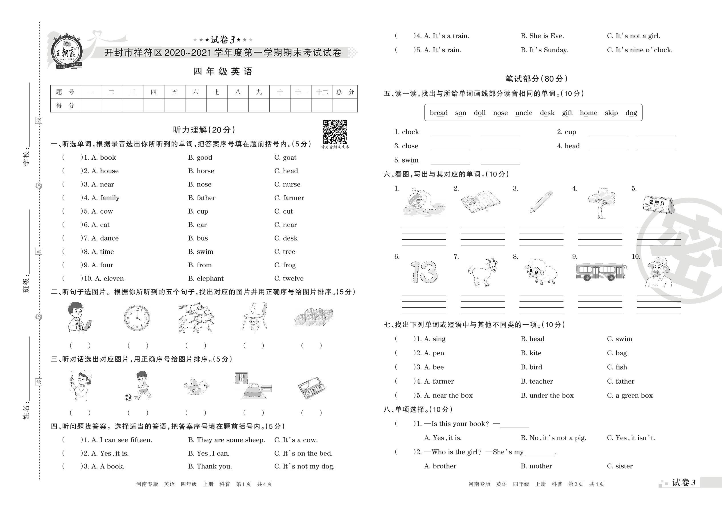 开封市祥符区2020~2021学年度第一学期期末考试试卷四年级英语(科普版)【3】