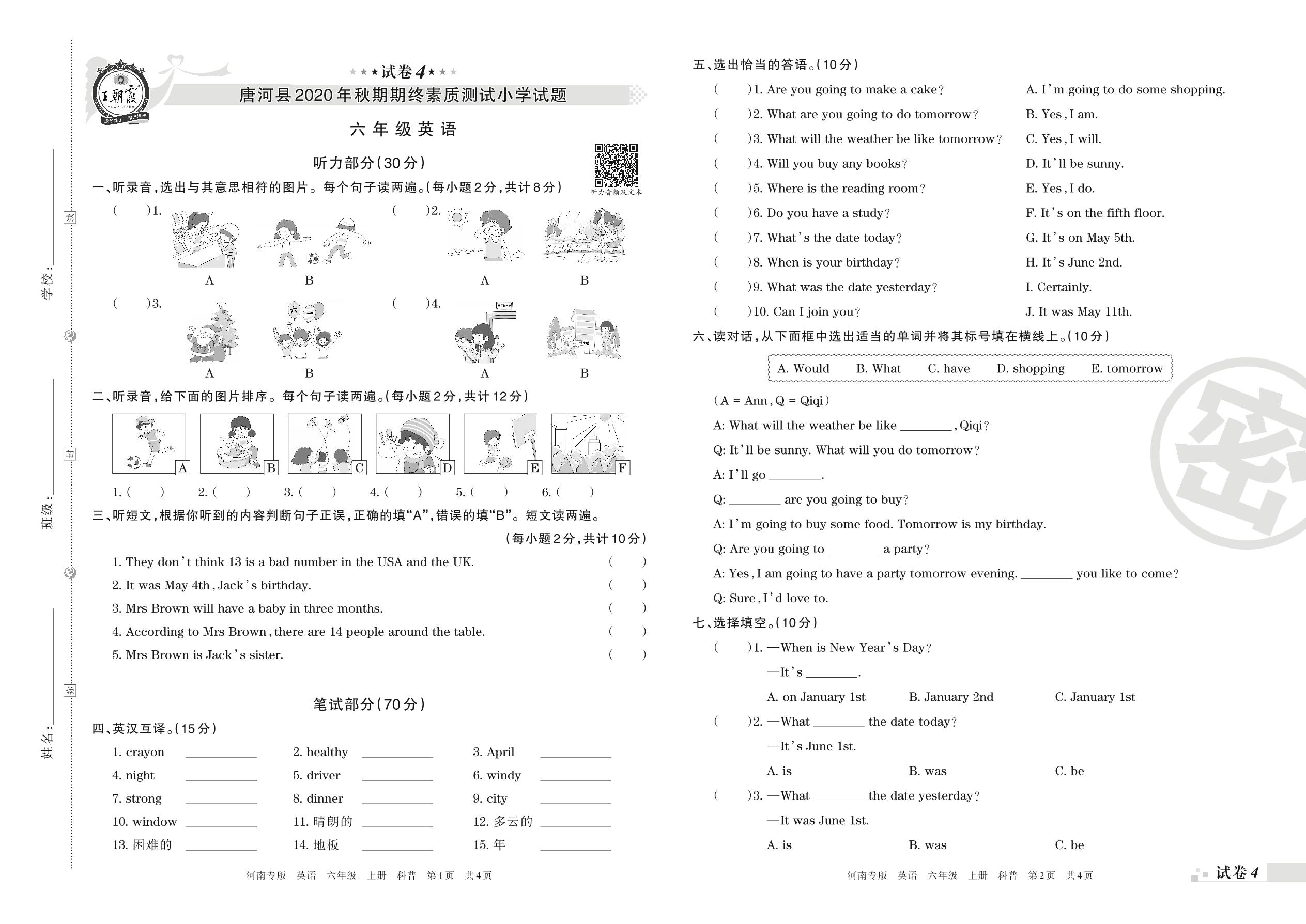 唐河县2020年秋期期终素质测试小学试题六年级英语(科普版)【4】