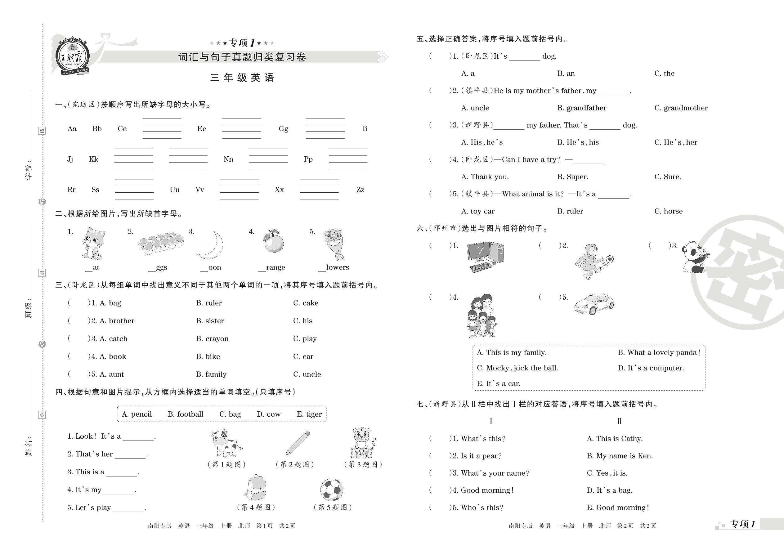 王朝霞期末专项卷——词汇与句子真题归类复习卷三年级上册英语(北师版)【1】