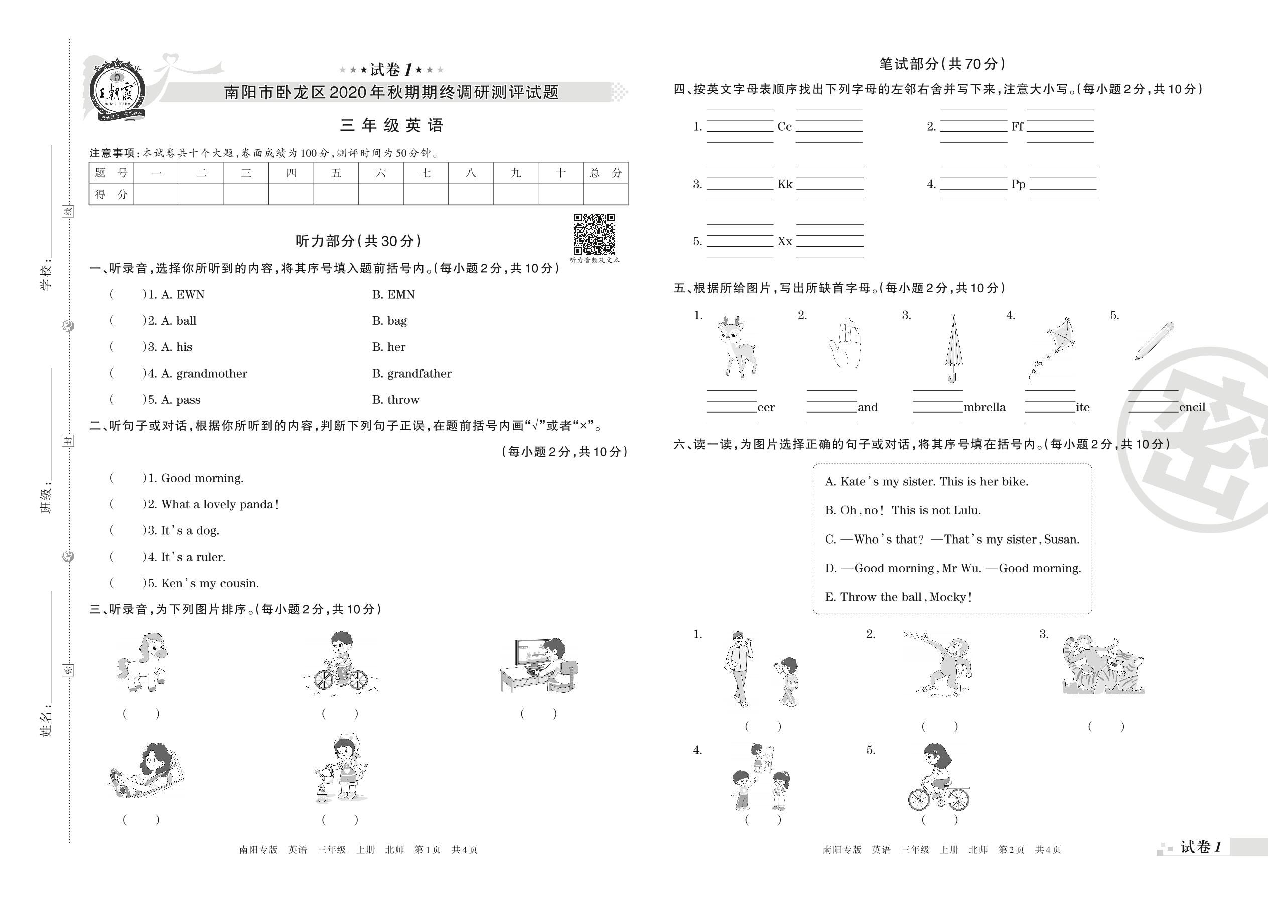 南阳市卧龙区2020年秋期期终调研测评试题三年级英语(北师版)【1】