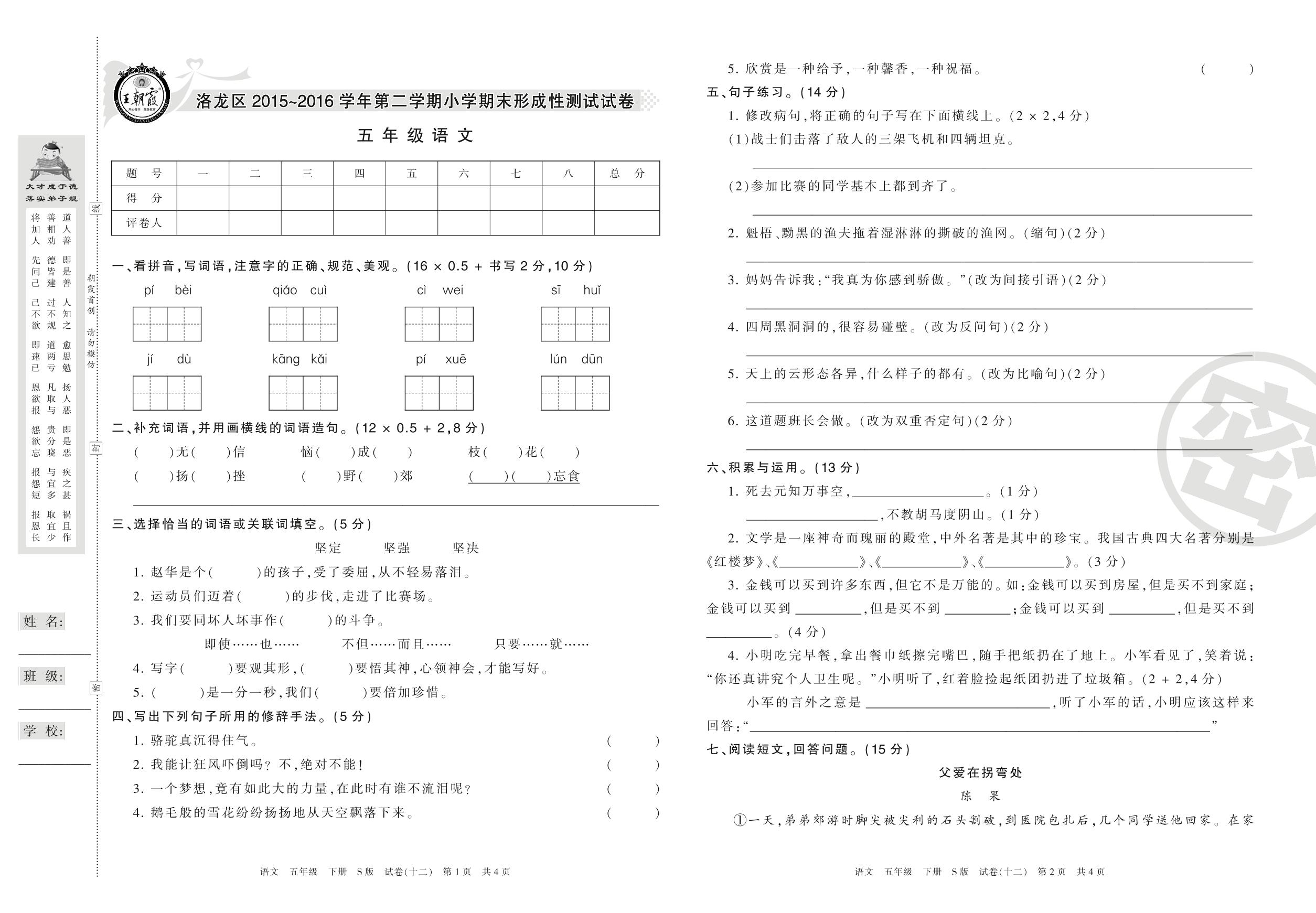 2015-2016学年第二学期洛阳市洛龙区五年级语文试卷(S版)【12】