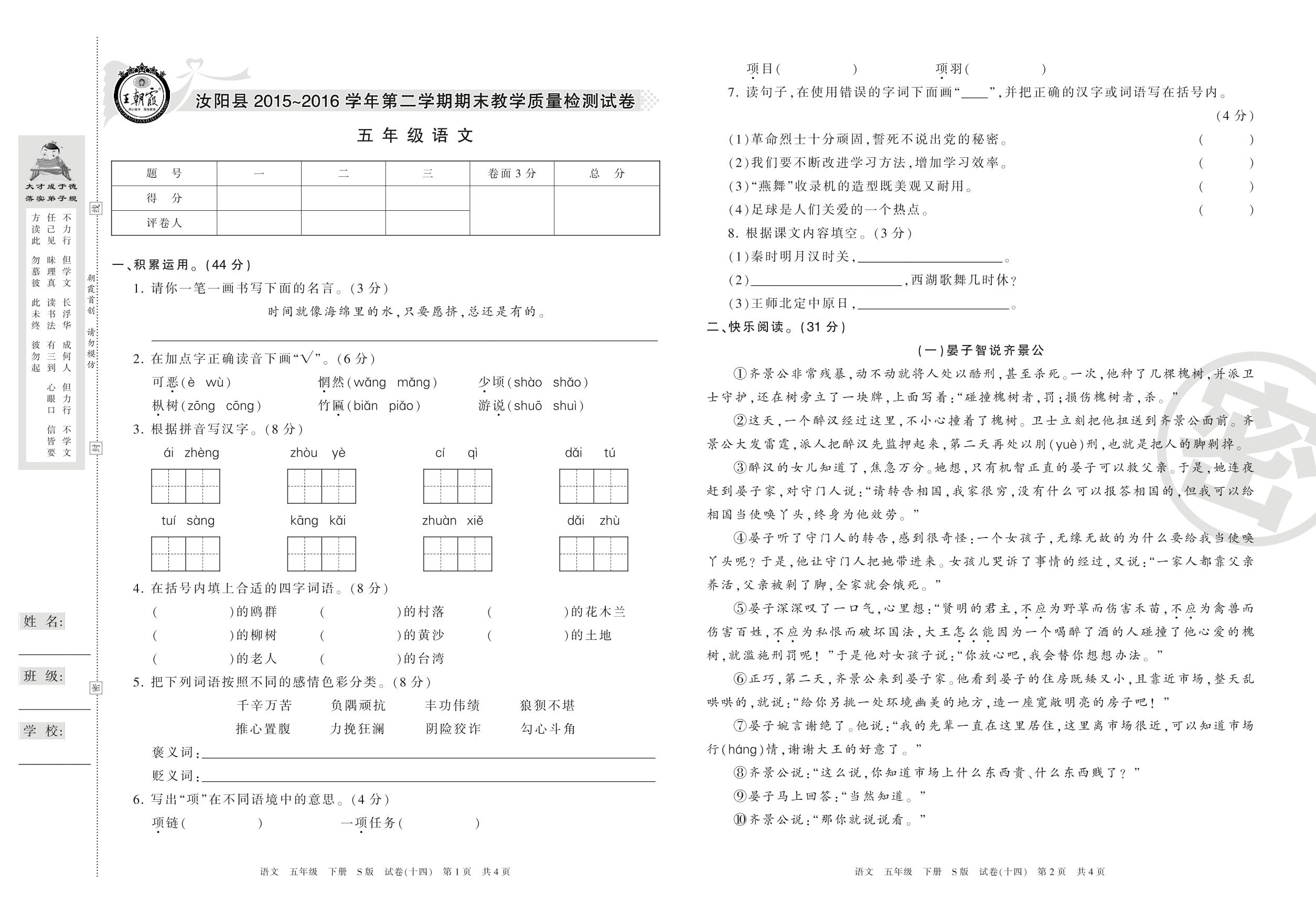 2015-2016学年第二学期洛阳市汝阳县五年级语文试卷(S版)【14】