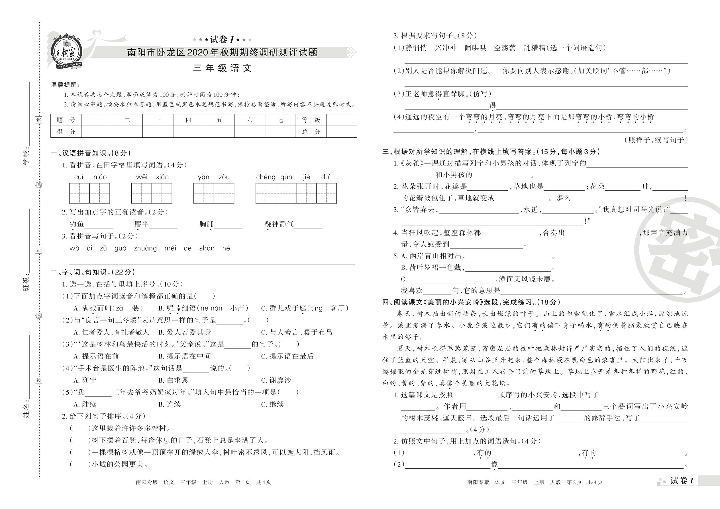 南阳市卧龙区2020年秋期期终调研测评试题三年级语文(人教版)【1】