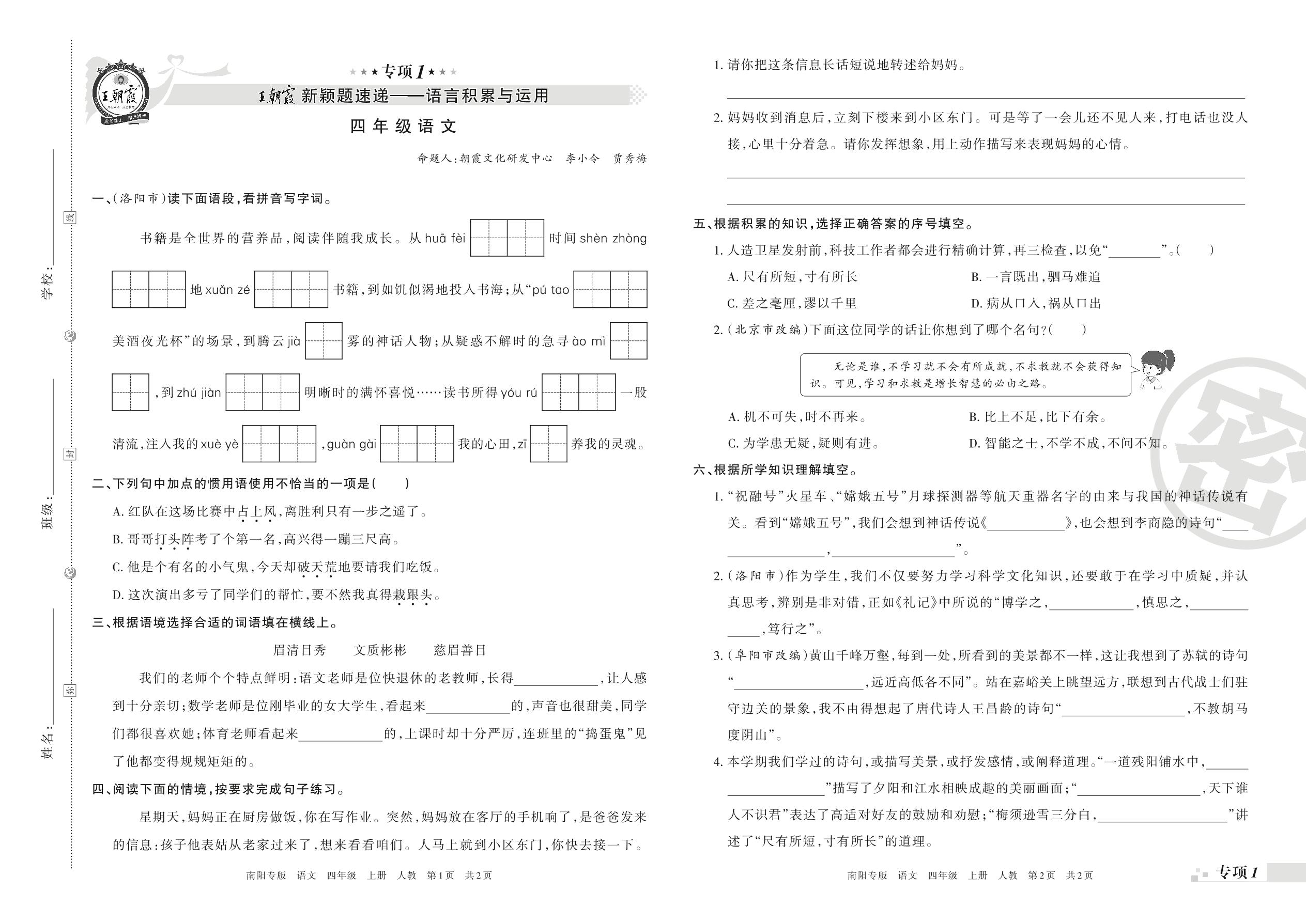 王朝霞期末专项卷——新颖题速递:语言积累与运用四年级上册语文(人教版)_R211201104155782【1】