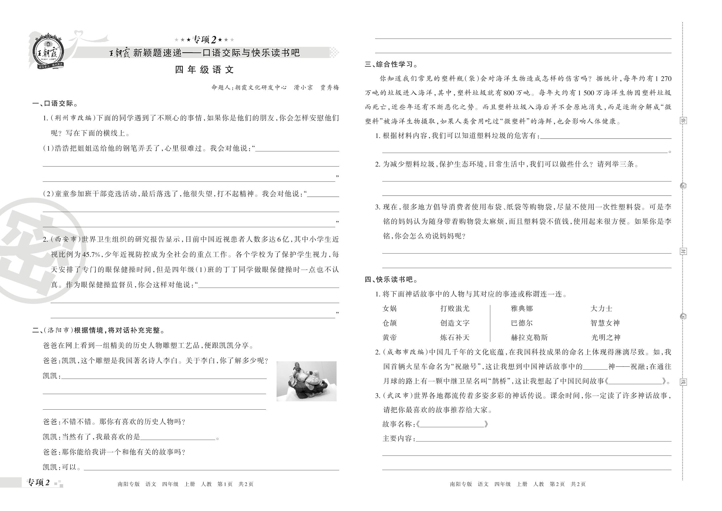 王朝霞期末专项卷——新颖题速递:口语交际与快乐读书吧四年级上册语文(人教版)_R211201104155396【2】