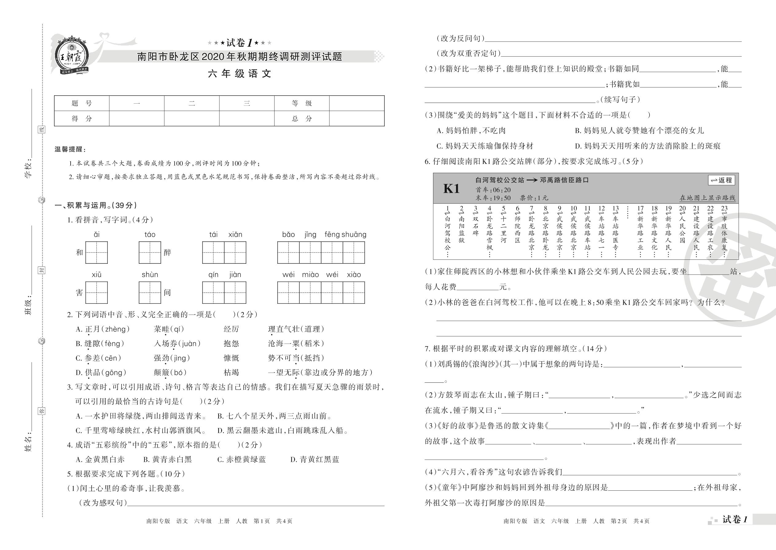 南阳市卧龙区2020年秋期期终调研测评试题六年级语文(人教版)【1】