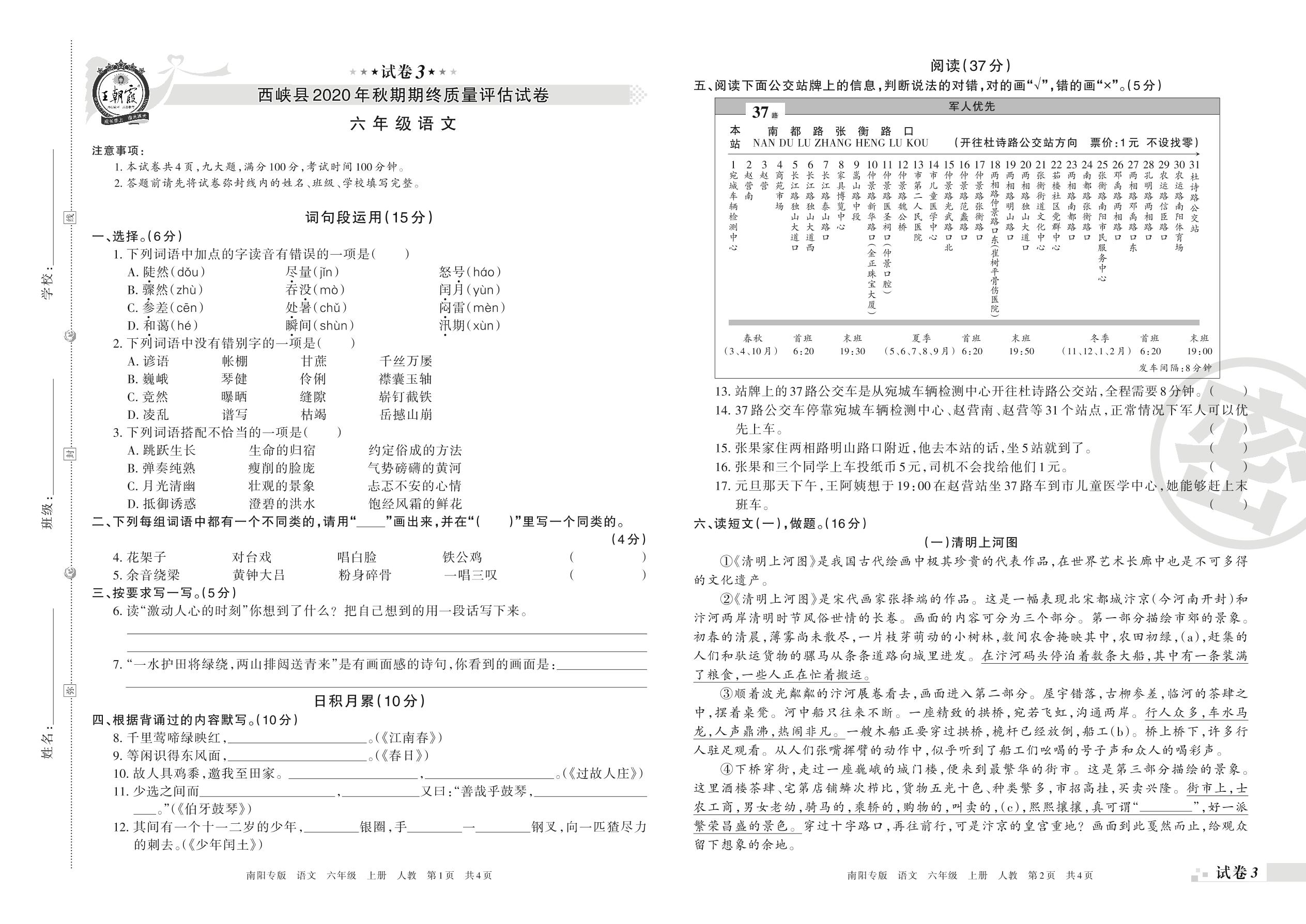 西峡县2020年秋期期终质量评估试卷六年级语文(人教版)【3】
