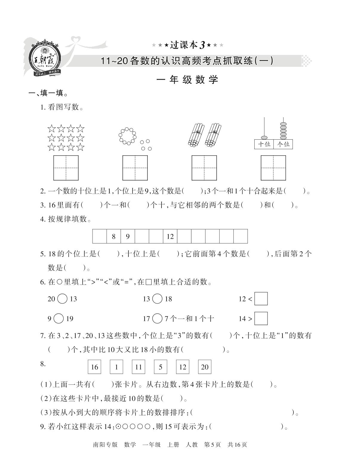 王朝霞期末过课本——11~20各数的认识高频考点抓取练(一)一年级上册数学(人教版)_R211201105600210【3】