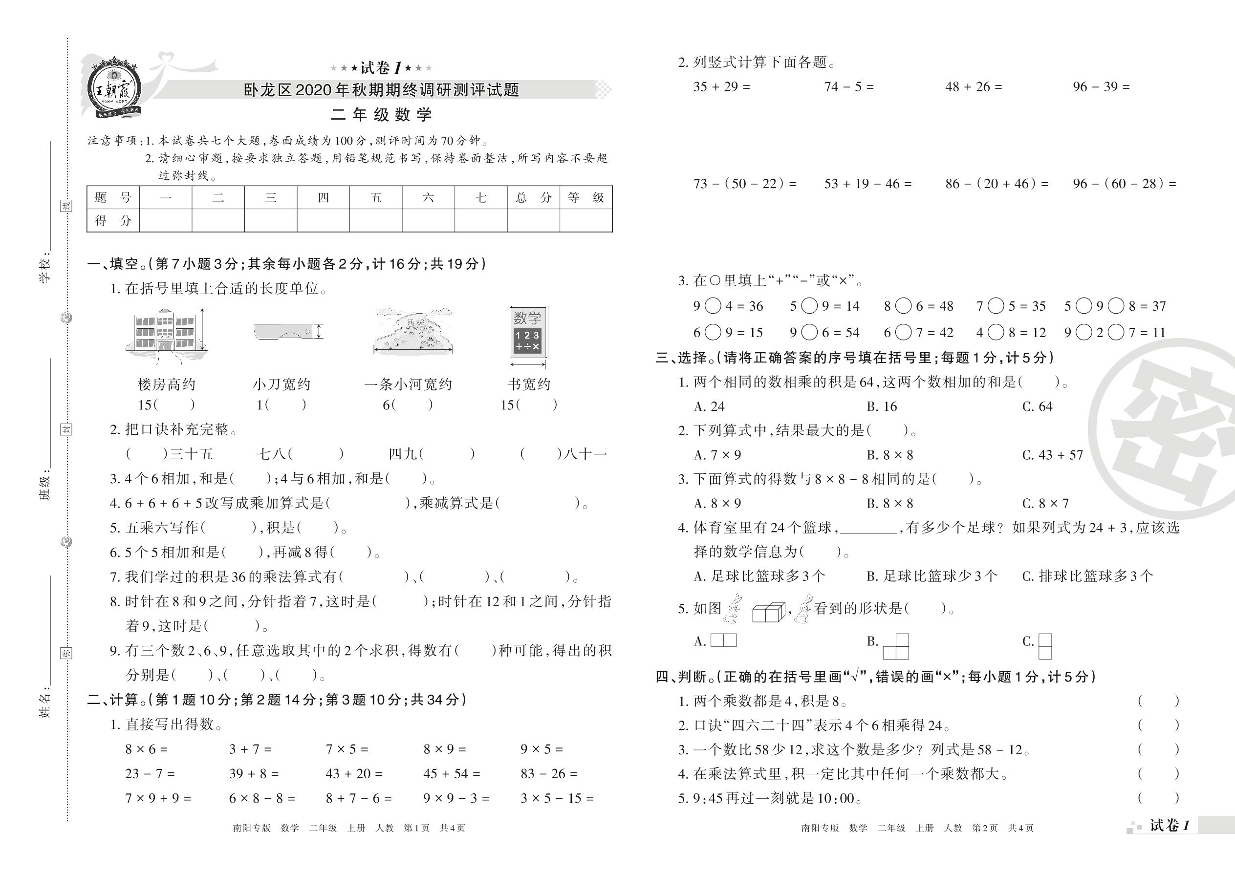 卧龙区2020年秋期期终调研测评试题二年级数学(人教版)【1】