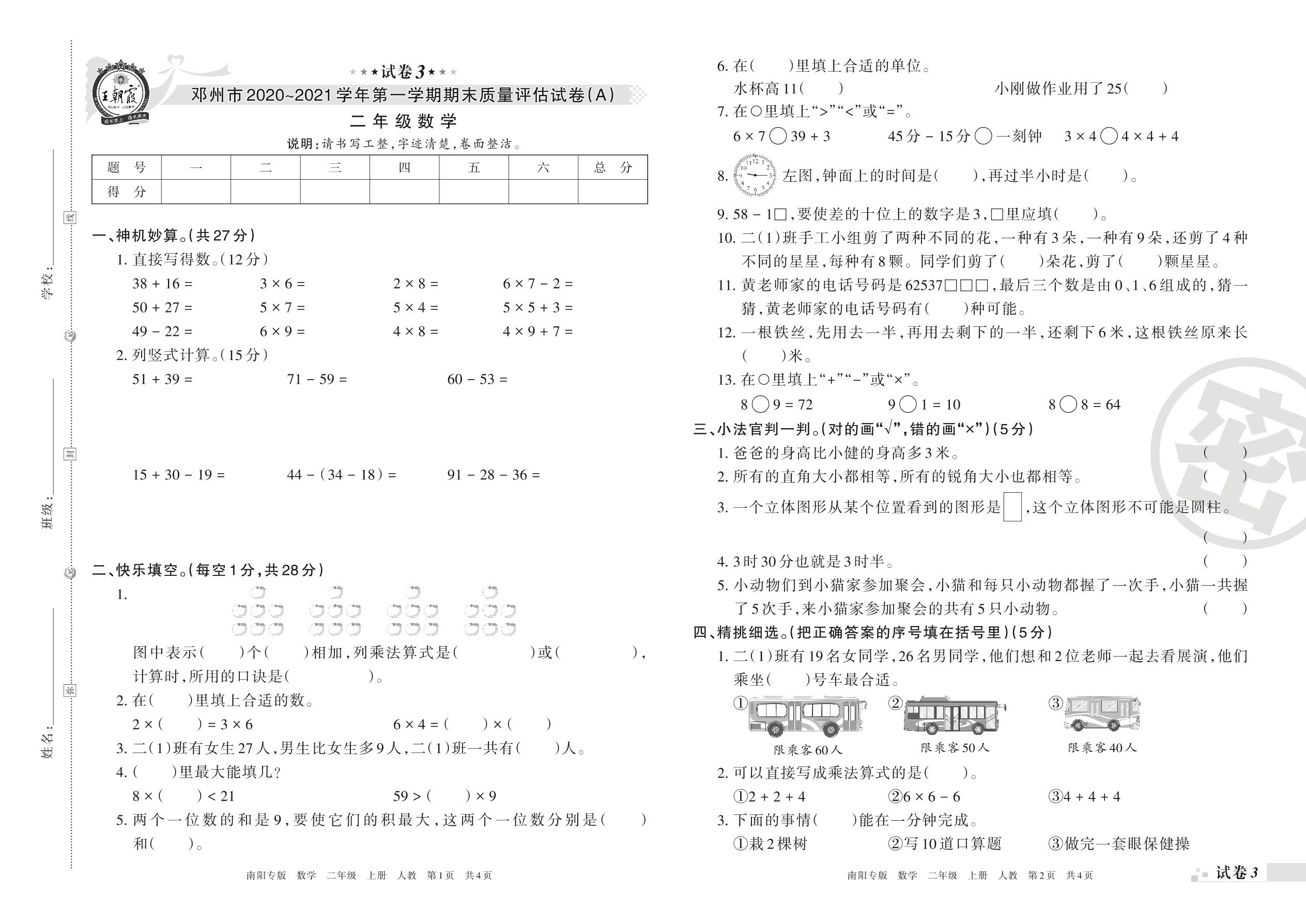 邓州市2020~2021学年第一学期期末质量评估试卷(A)二年级数学(人教版)【3】