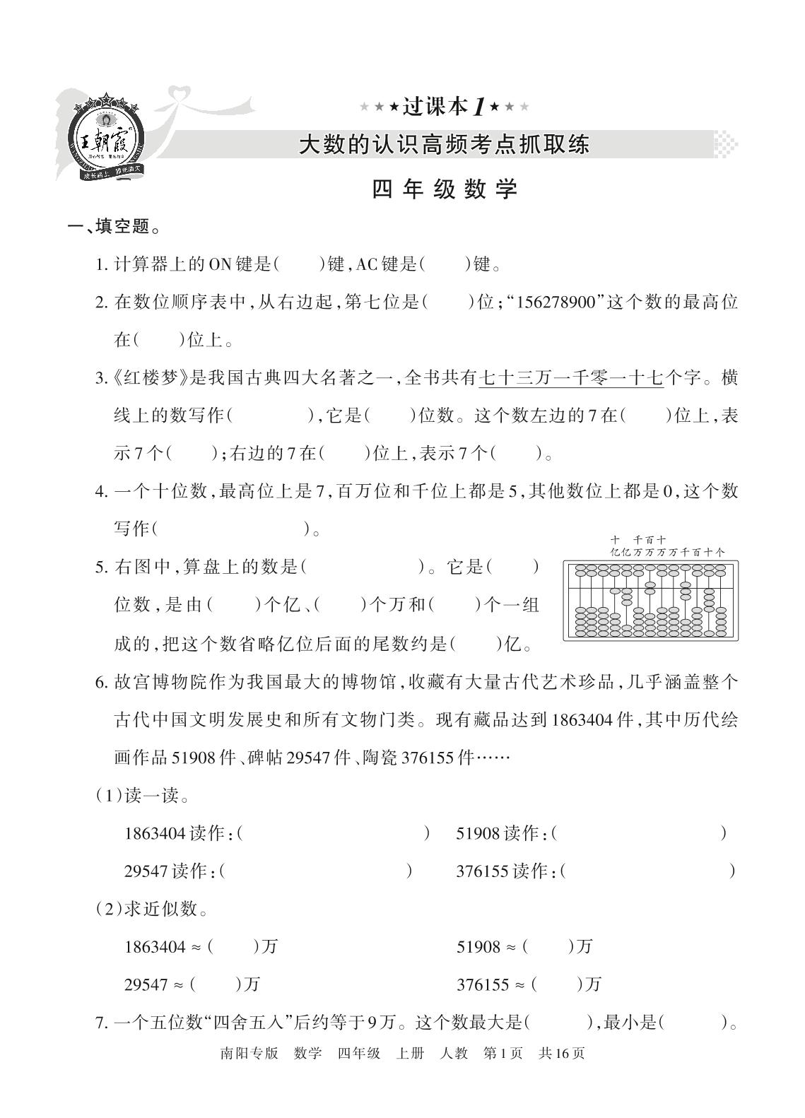 王朝霞期末过课本——大数的认识高频考点抓取练四年级上册数学(人教版)_R211201111804699【1】