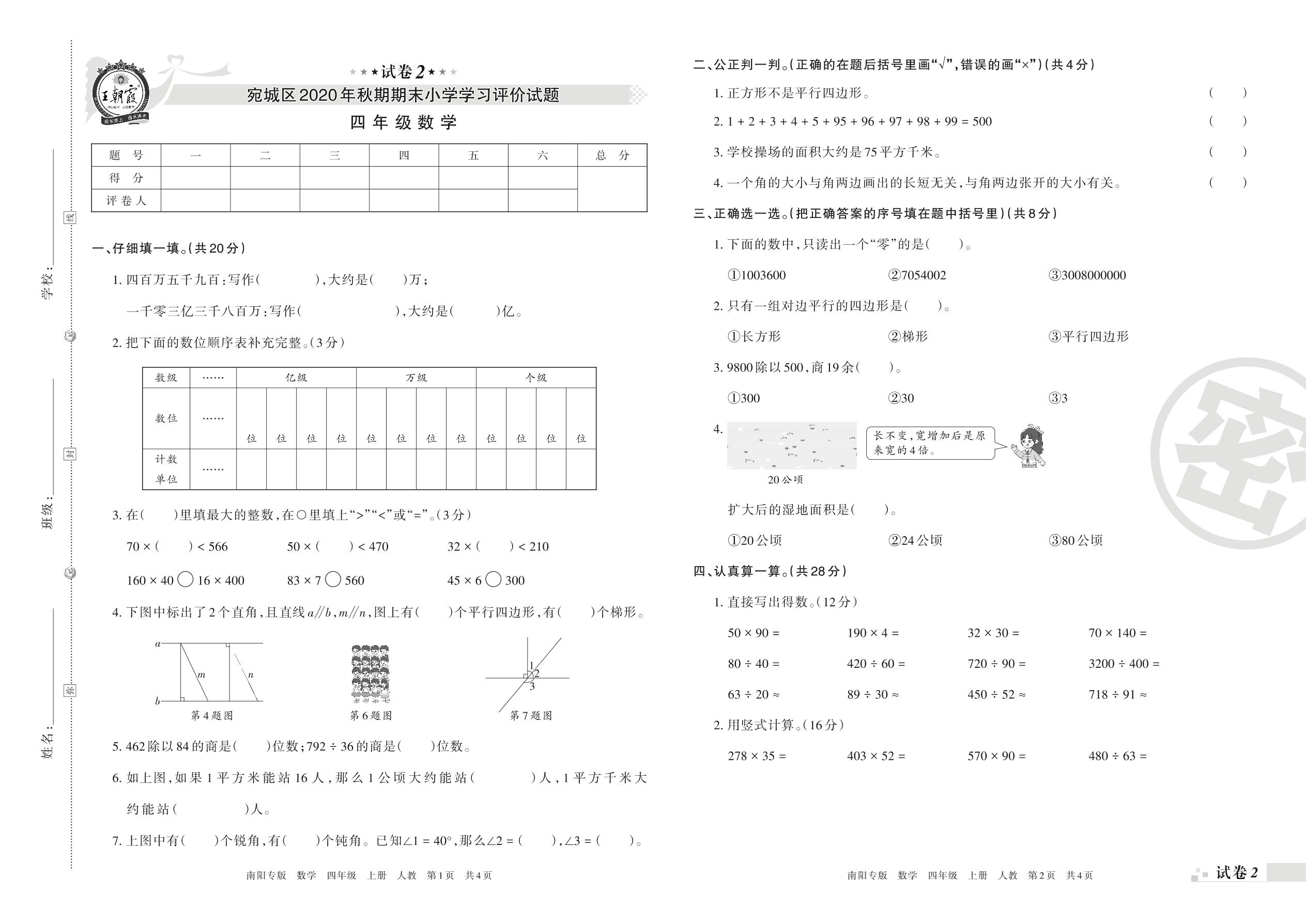 宛城区2020年秋期期末小学学习评价试题四年级数学(人教版)【2】