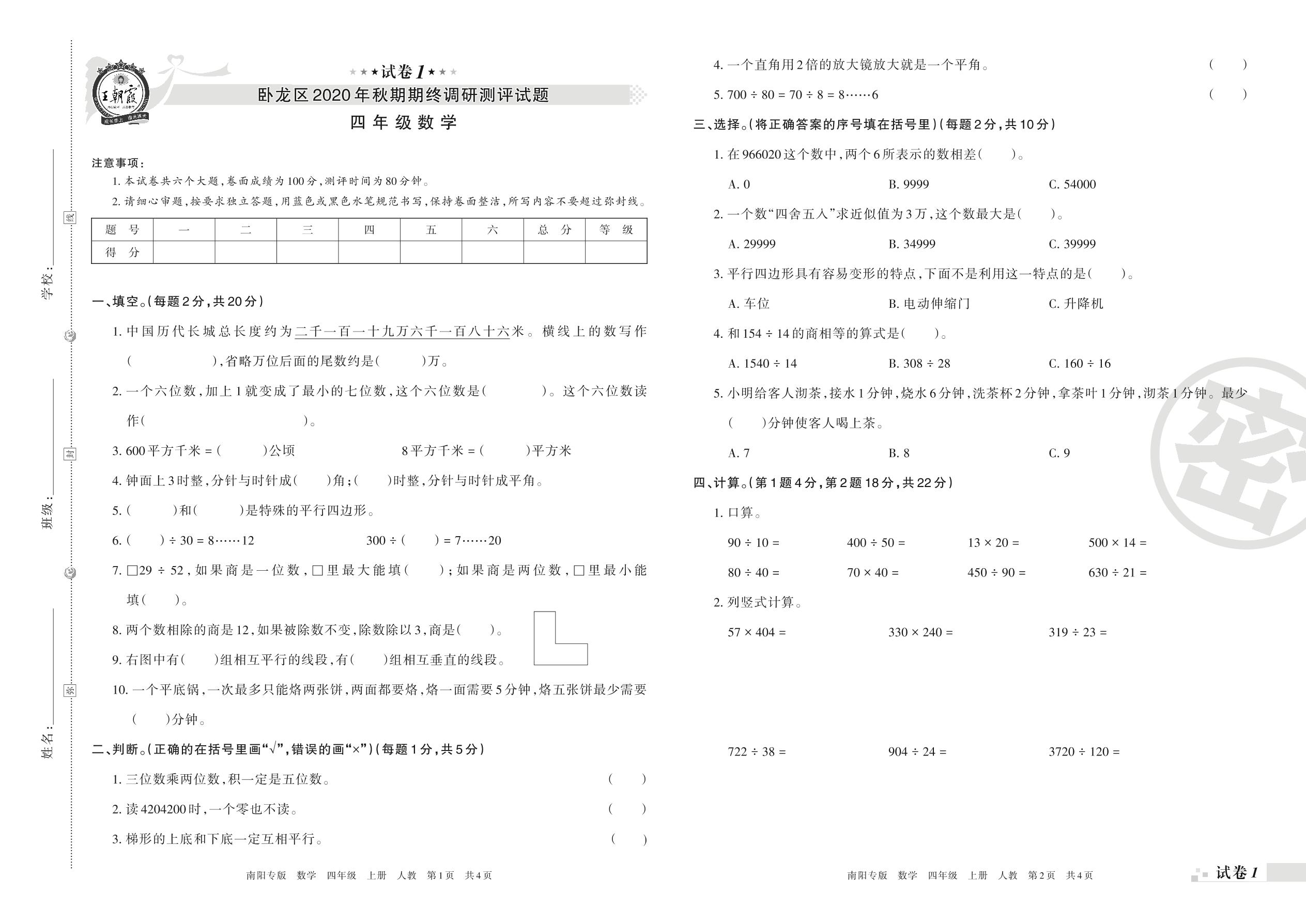 卧龙区2020年秋期期终调研测评试题四年级数学(人教版)【1】