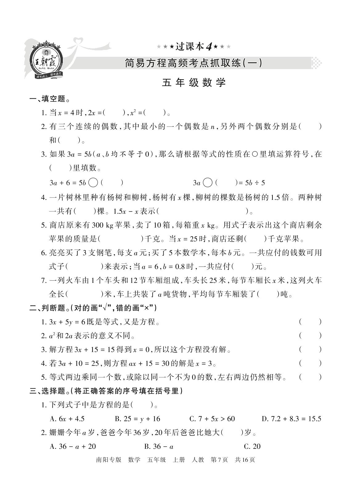 王朝霞期末过课本——简易方程高频考点抓取练(一)五年级上册数学(人教版)_R211201112050152【4】