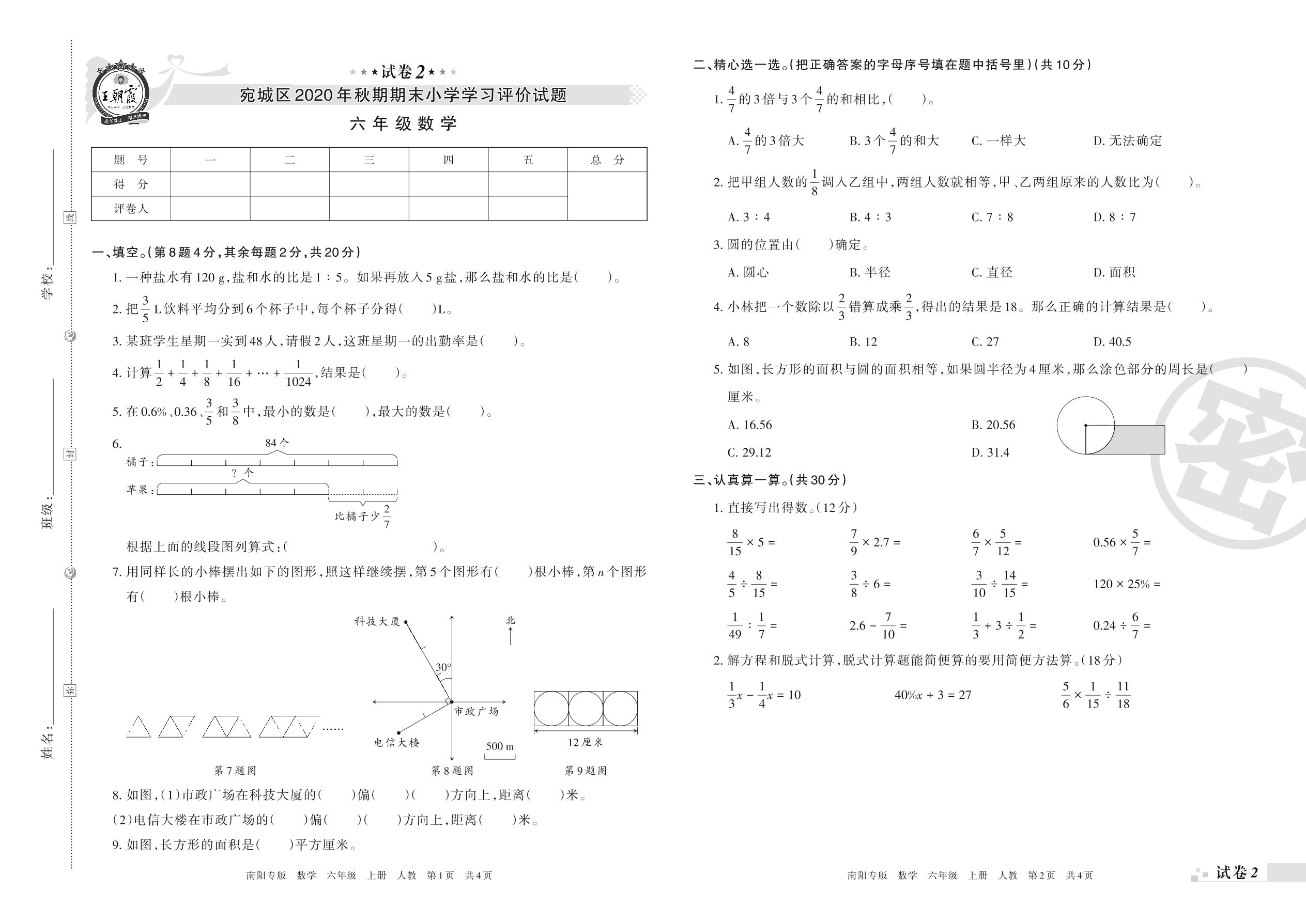 宛城区2020年秋期期末小学学习评价试题六年级数学(人教版)【2】