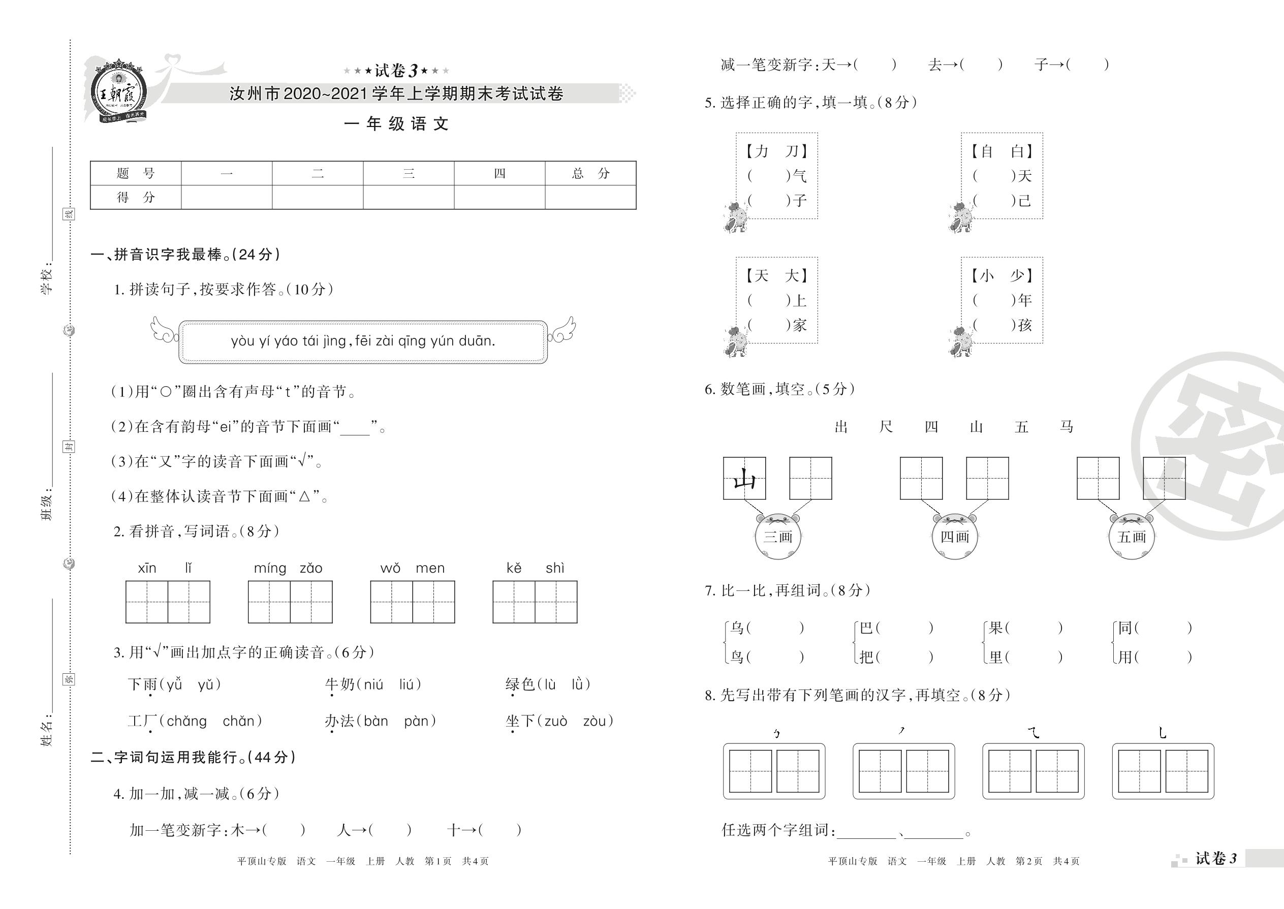 汝州市2020~2021学年上学期期末考试试卷一年级语文(人教版)【3】