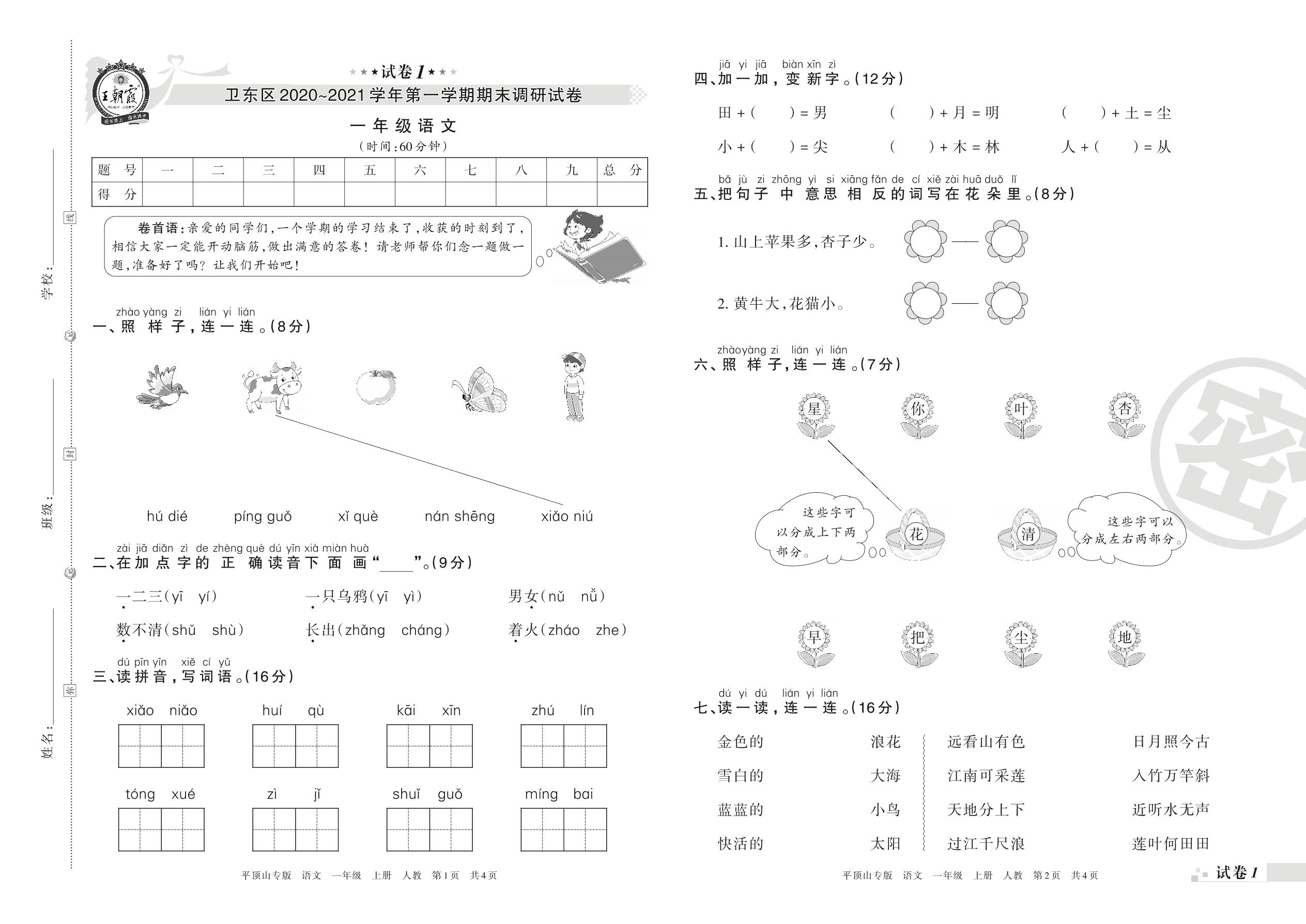 一年级语文人教版上册期末卷