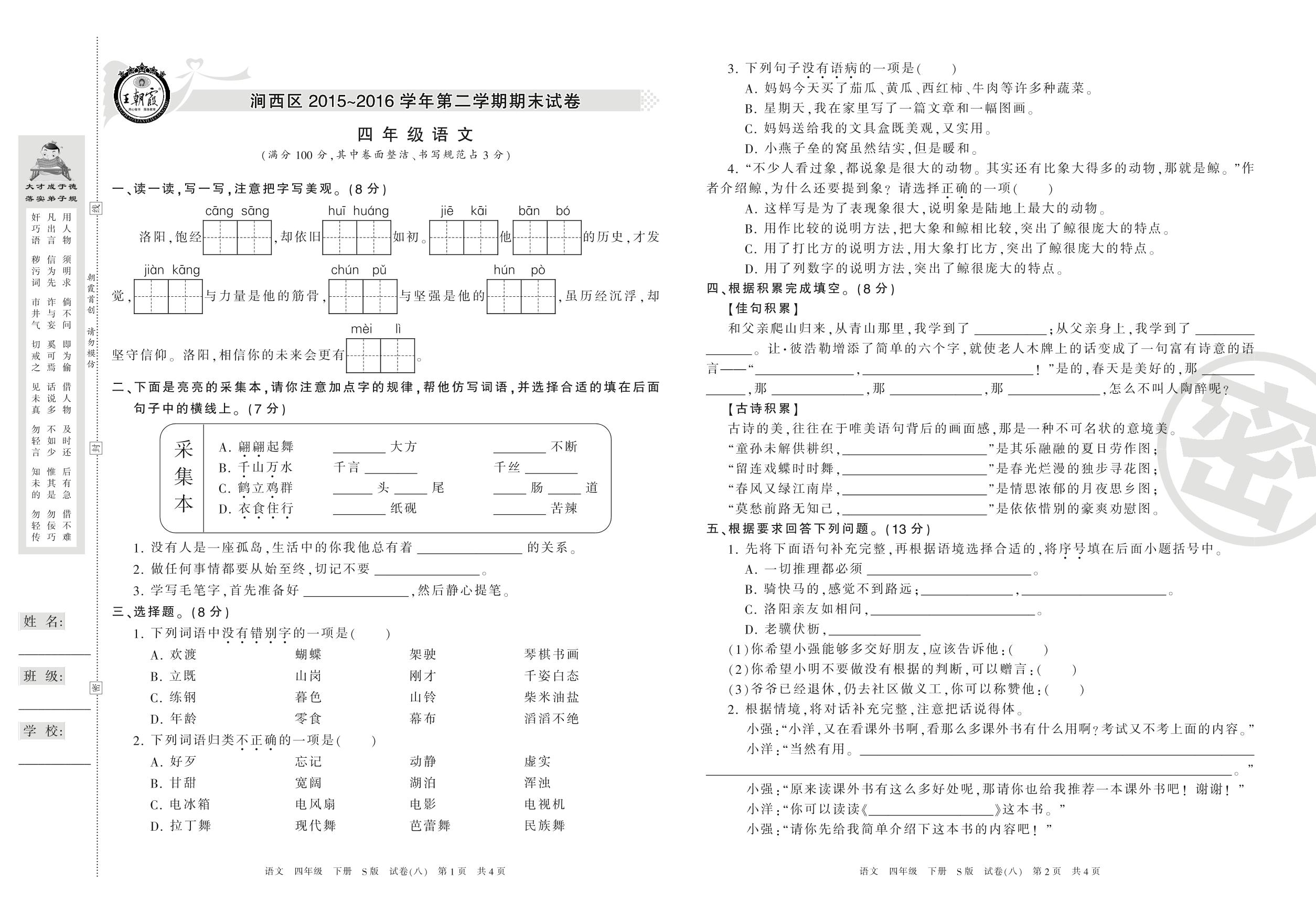 2015-2016学年第二学期洛阳市涧西区四年级语文试卷(S版)【8】