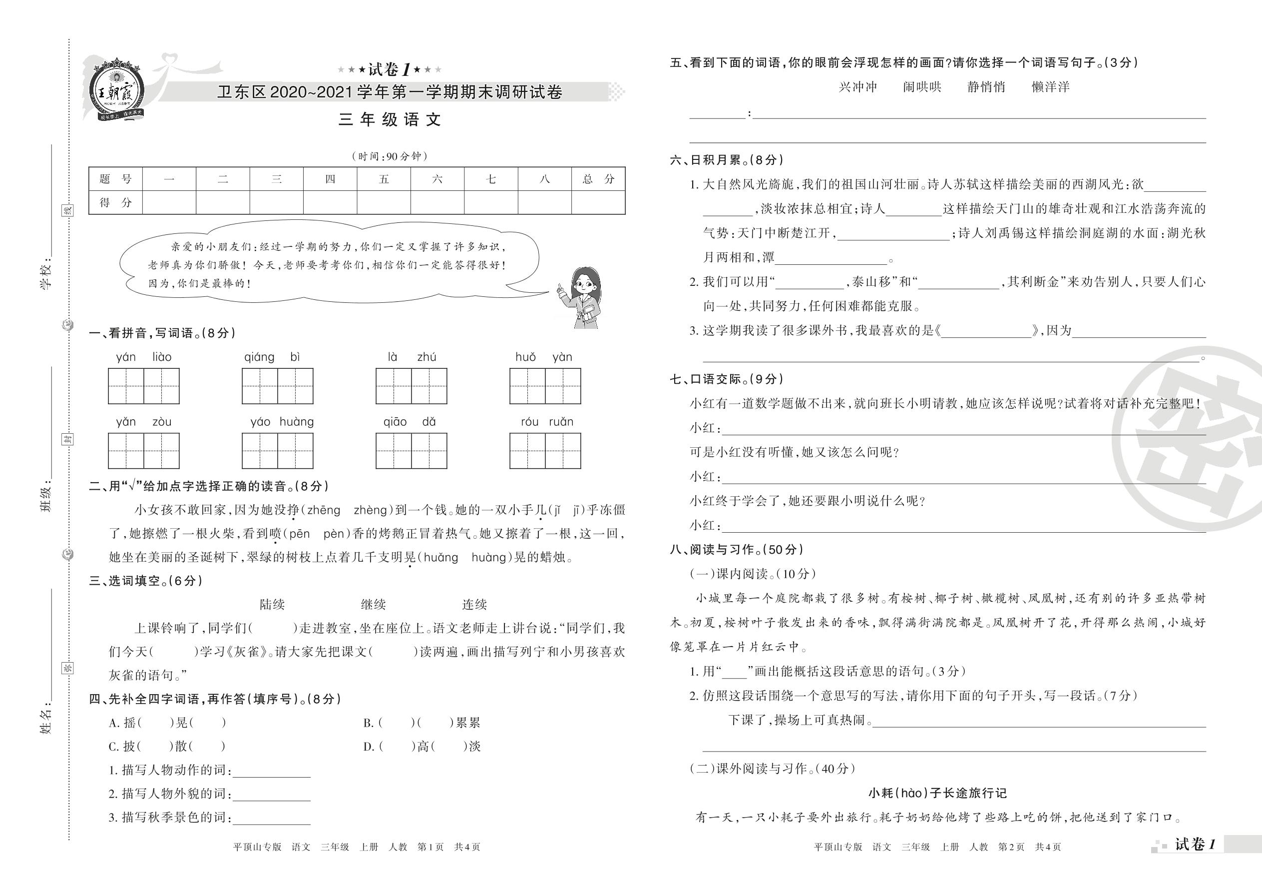 卫东区2020~2021学年第一学期期末调研试卷三年级语文(人教版)【1】