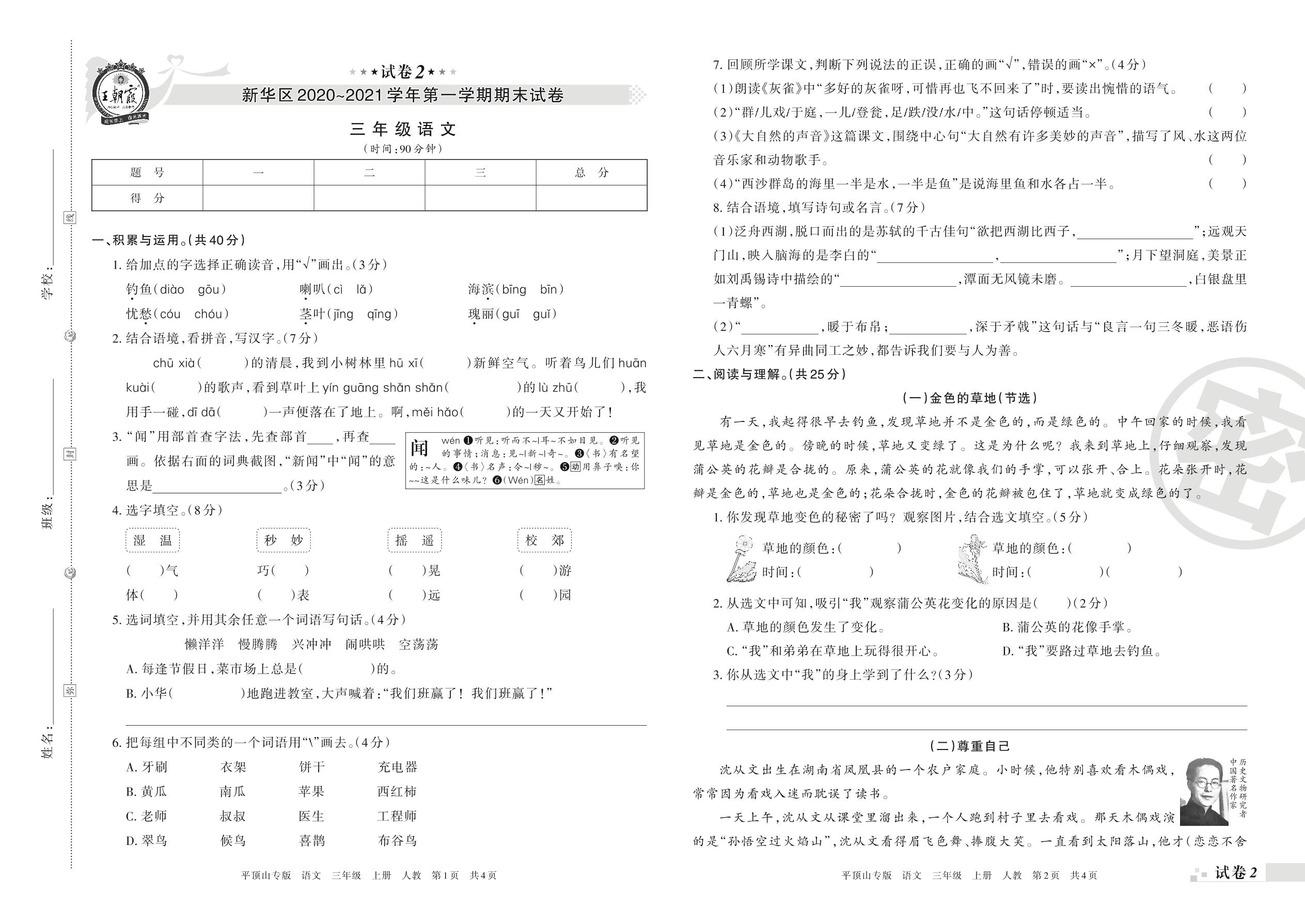 新华区2020~2021学年第一学期期末试卷三年级语文(人教版)【2】