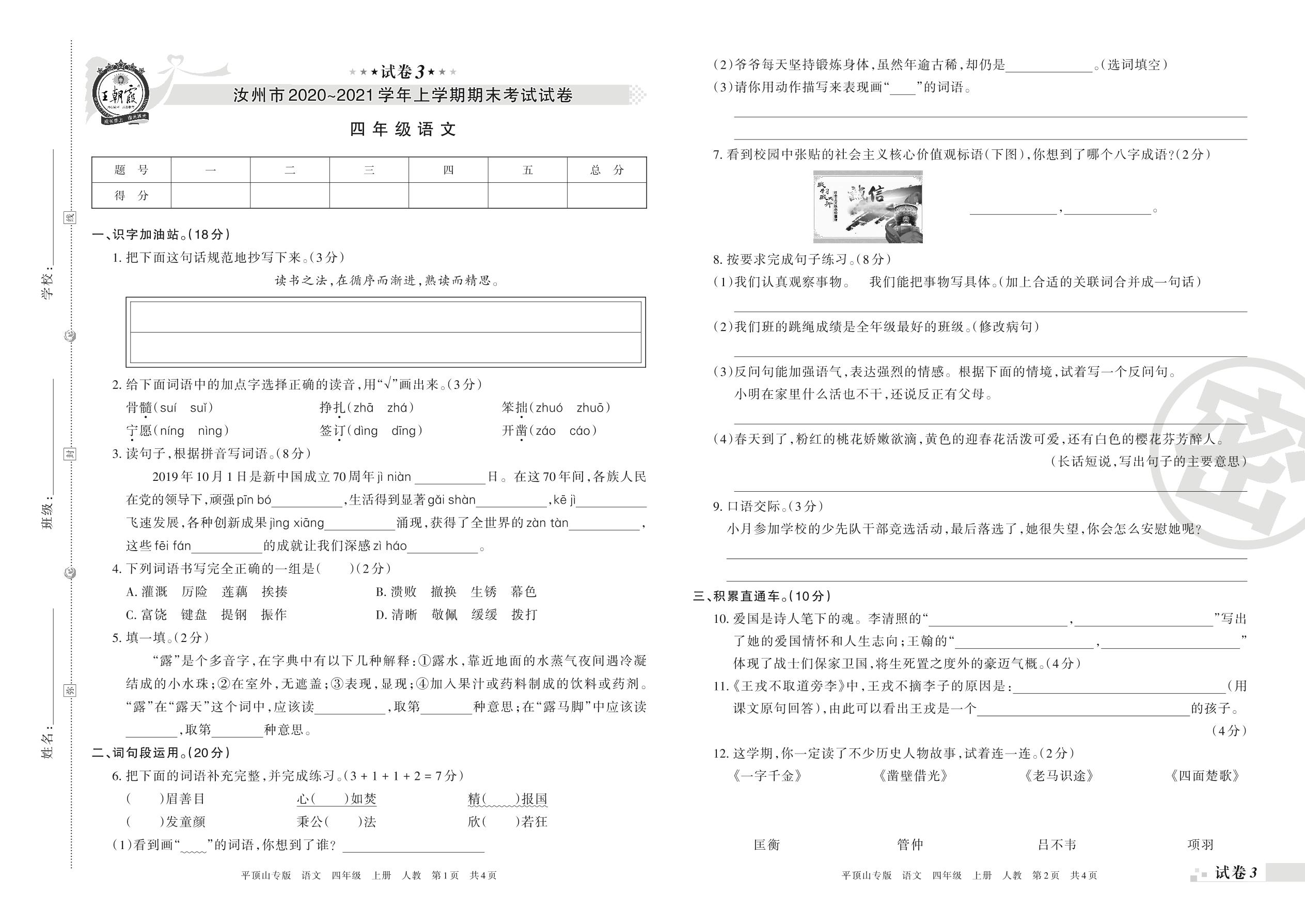 汝州市2020~2021学年上学期期末考试试卷四年级语文(人教版)【3】