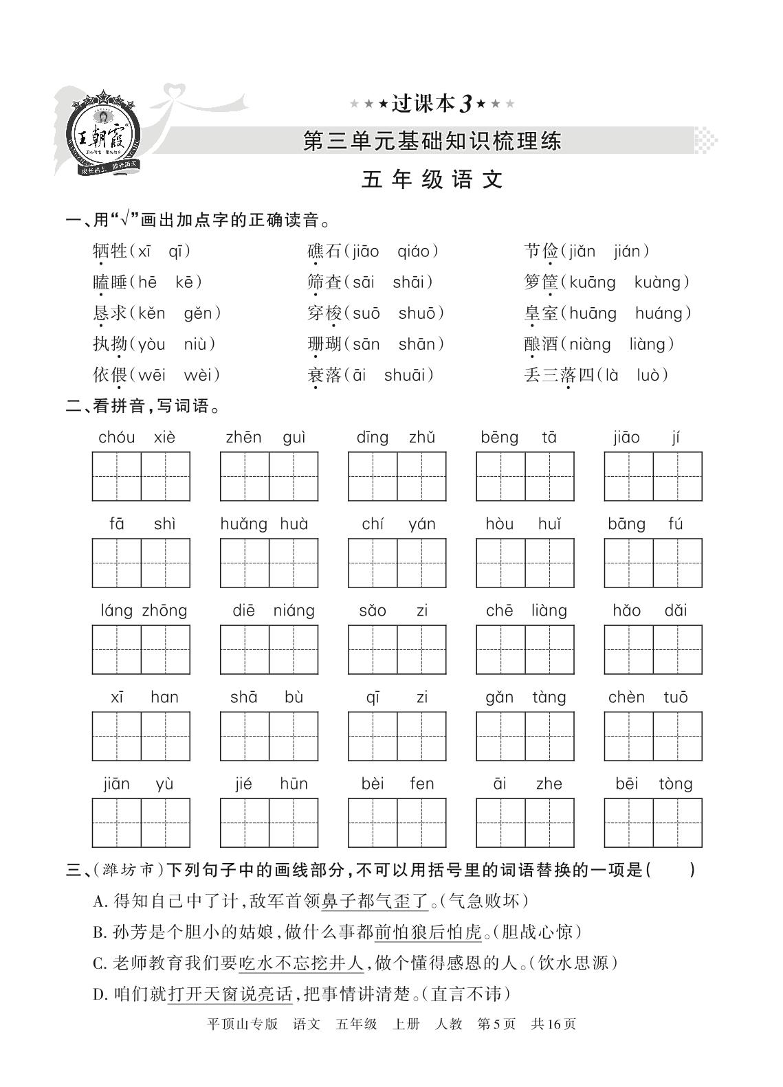 王朝霞期末过课本——第三单元基础知识梳理练五年级上册语文(人教版)_R211201135823539【3】