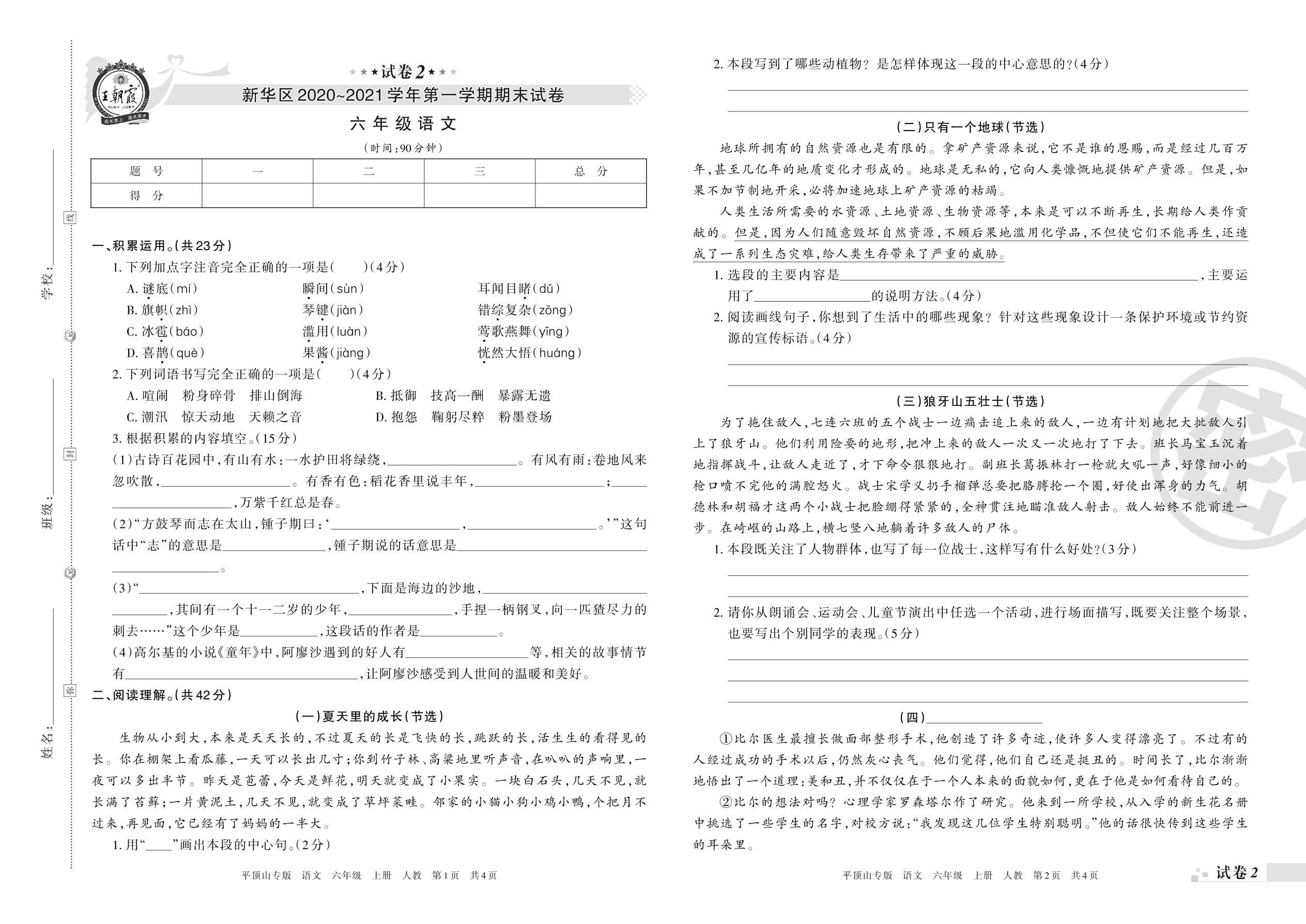 新华区2020~2021 学年第一学期期末试卷六年级语文(人教版)【2】