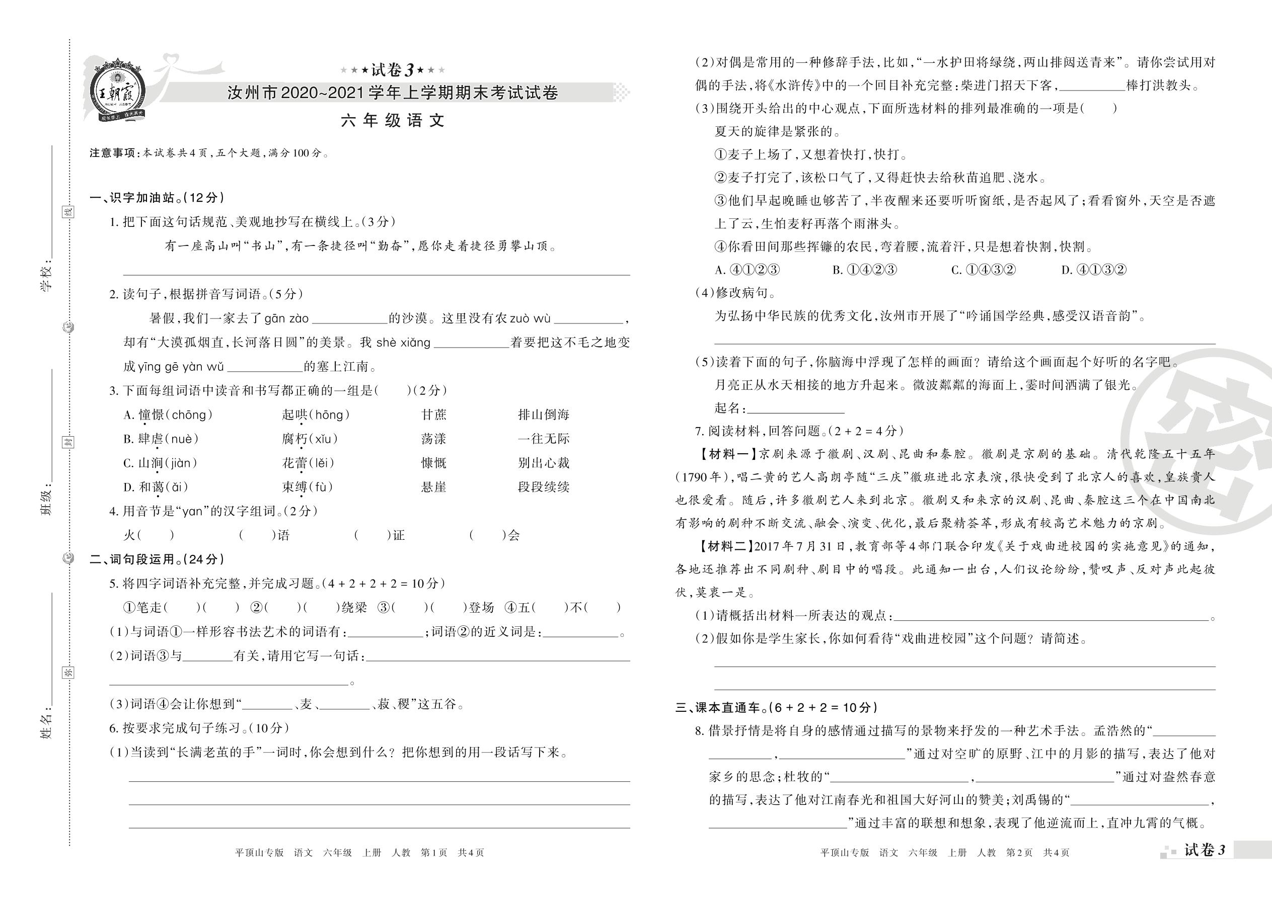 汝州市2020~2021 学年上学期期末考试试卷六年级语文(人教版)【3】
