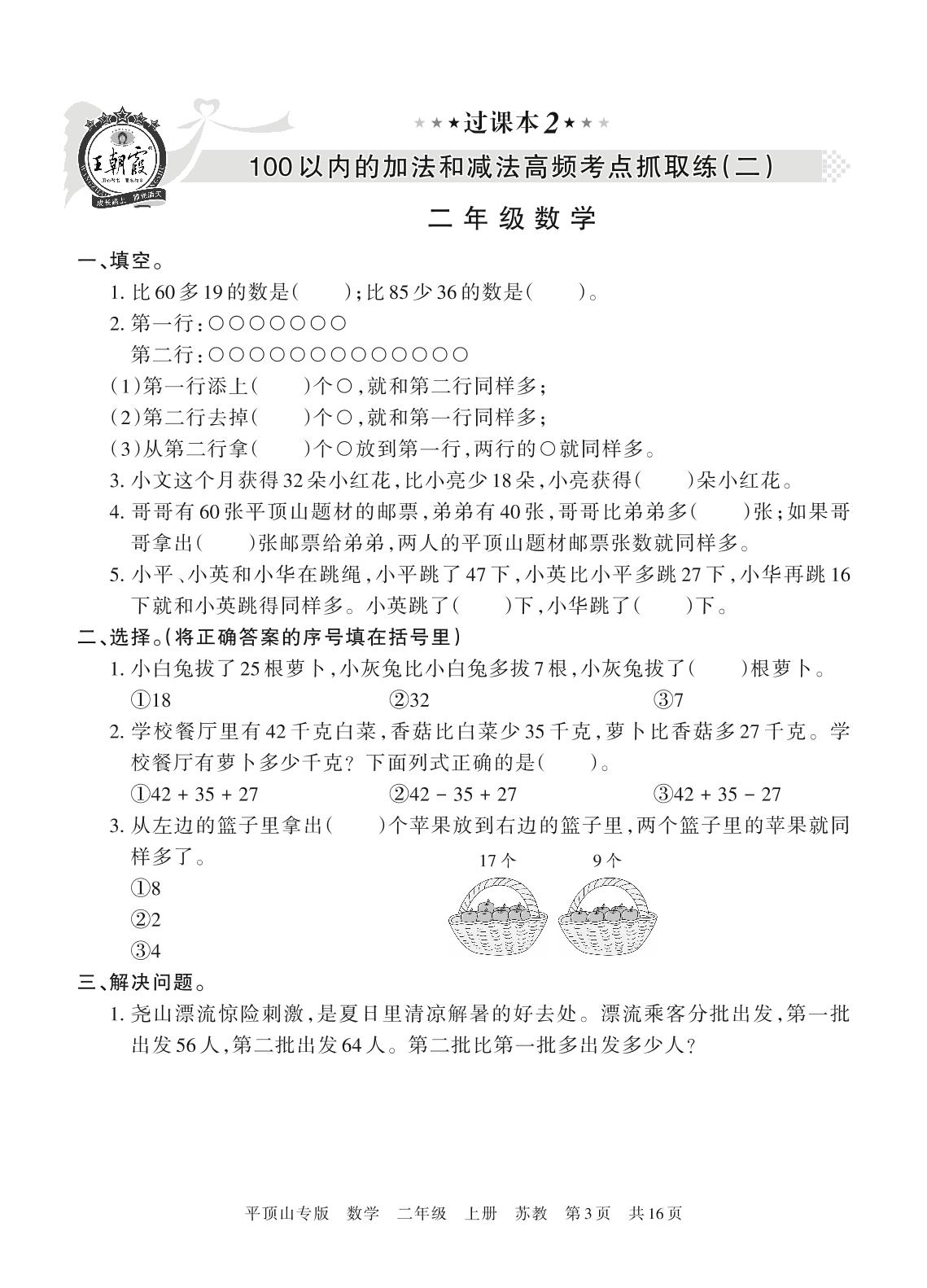 王朝霞期末过课本——100以内的加法和减法高频考点抓取练(二)二年级上册数学(苏教版)_R211201141055689【2】