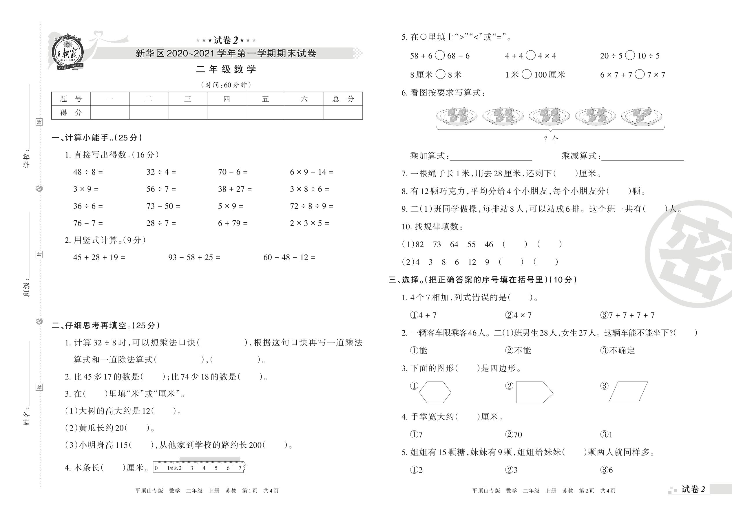 新华区2020~2021学年第一学期期末试卷二年级数学(苏教版)【2】