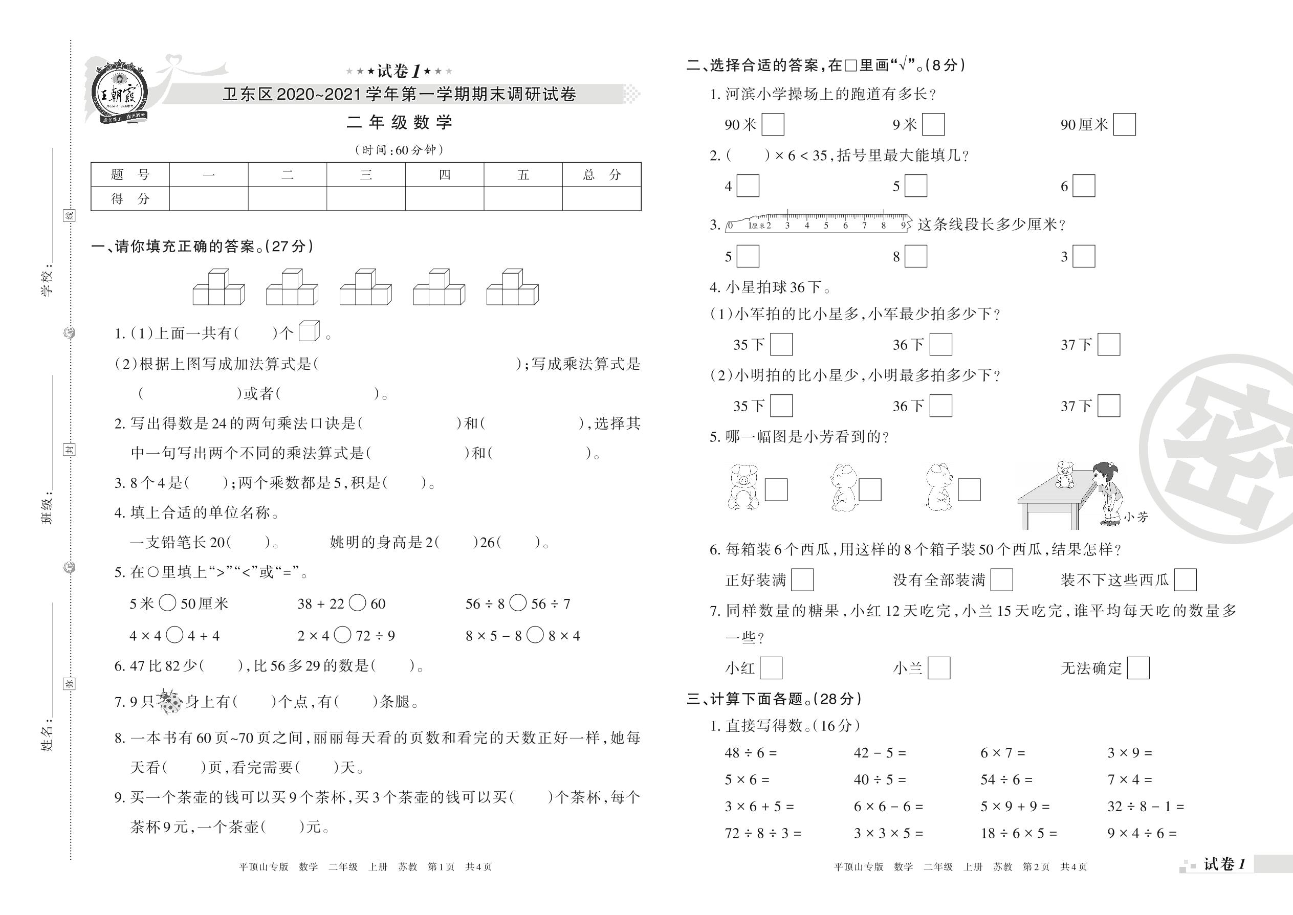 卫东区2020~2021学年第一学期期末调研试卷二年级数学(苏教版)【1】