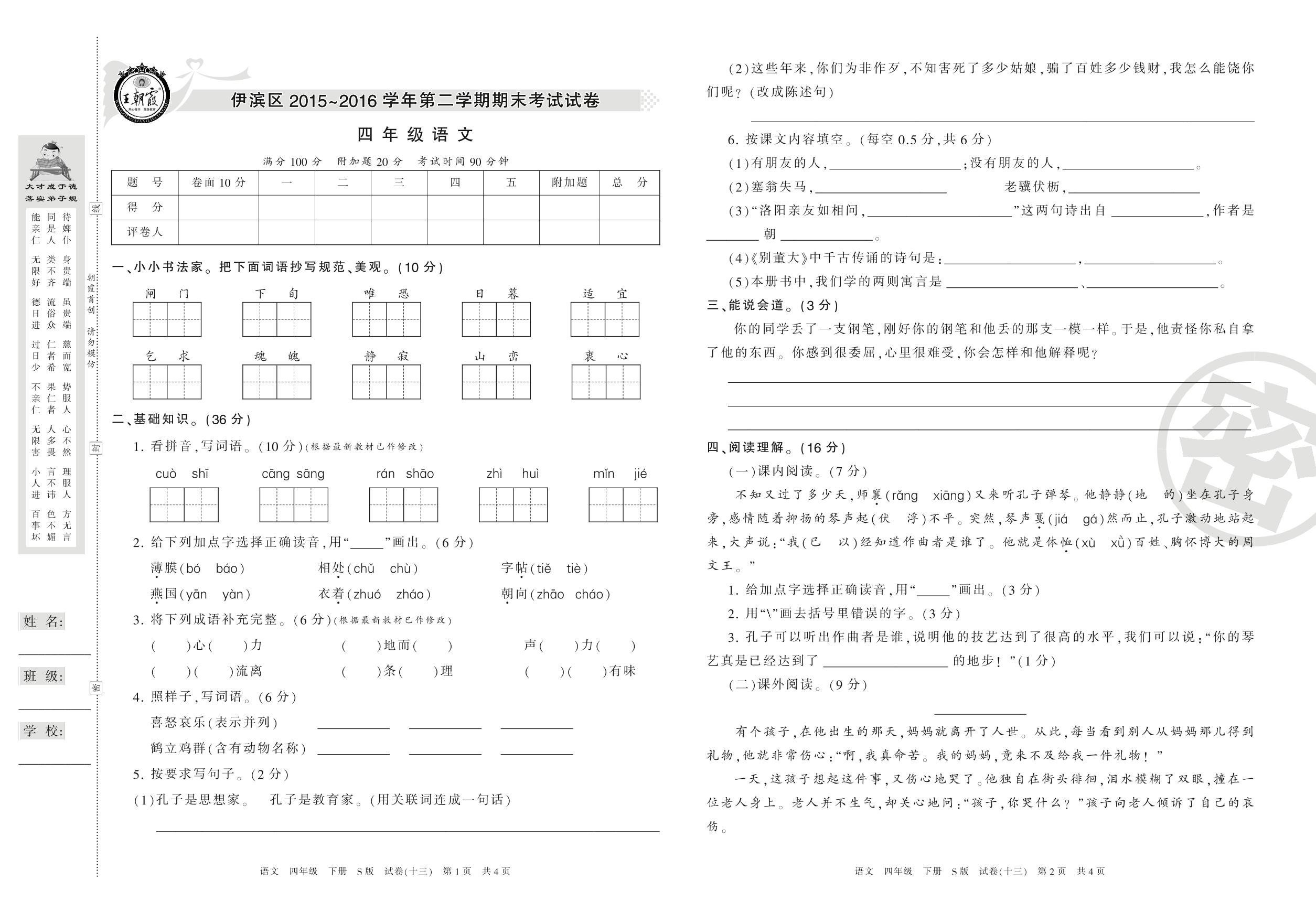 2015-2016学年第二学期洛阳市伊滨区四年级语文试卷(S版)【13】