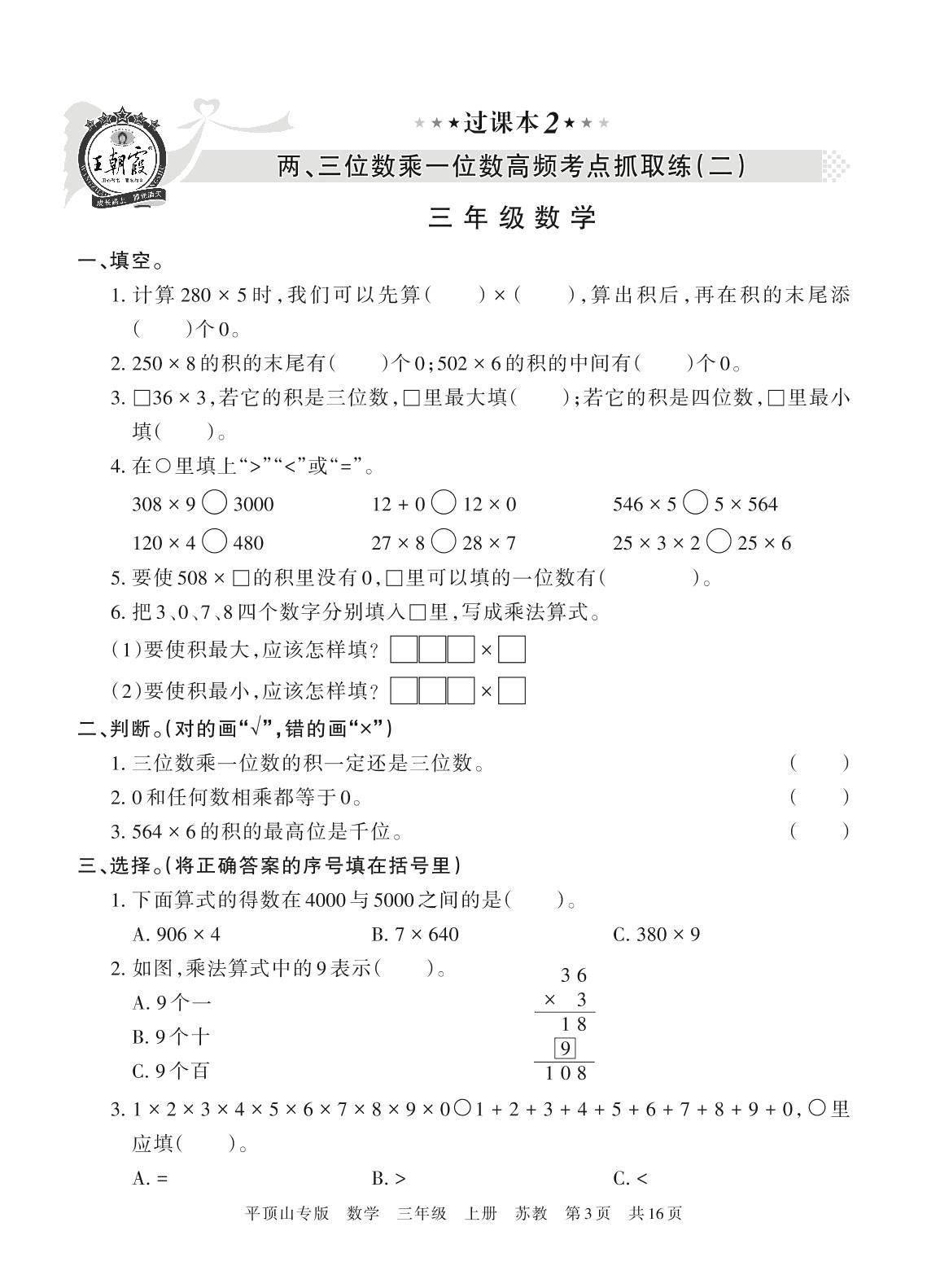 王朝霞期末过课本——两、三位数乘一位数高频考点抓取练(二)三年级上册数学(苏教版)_R211201141339072【2】