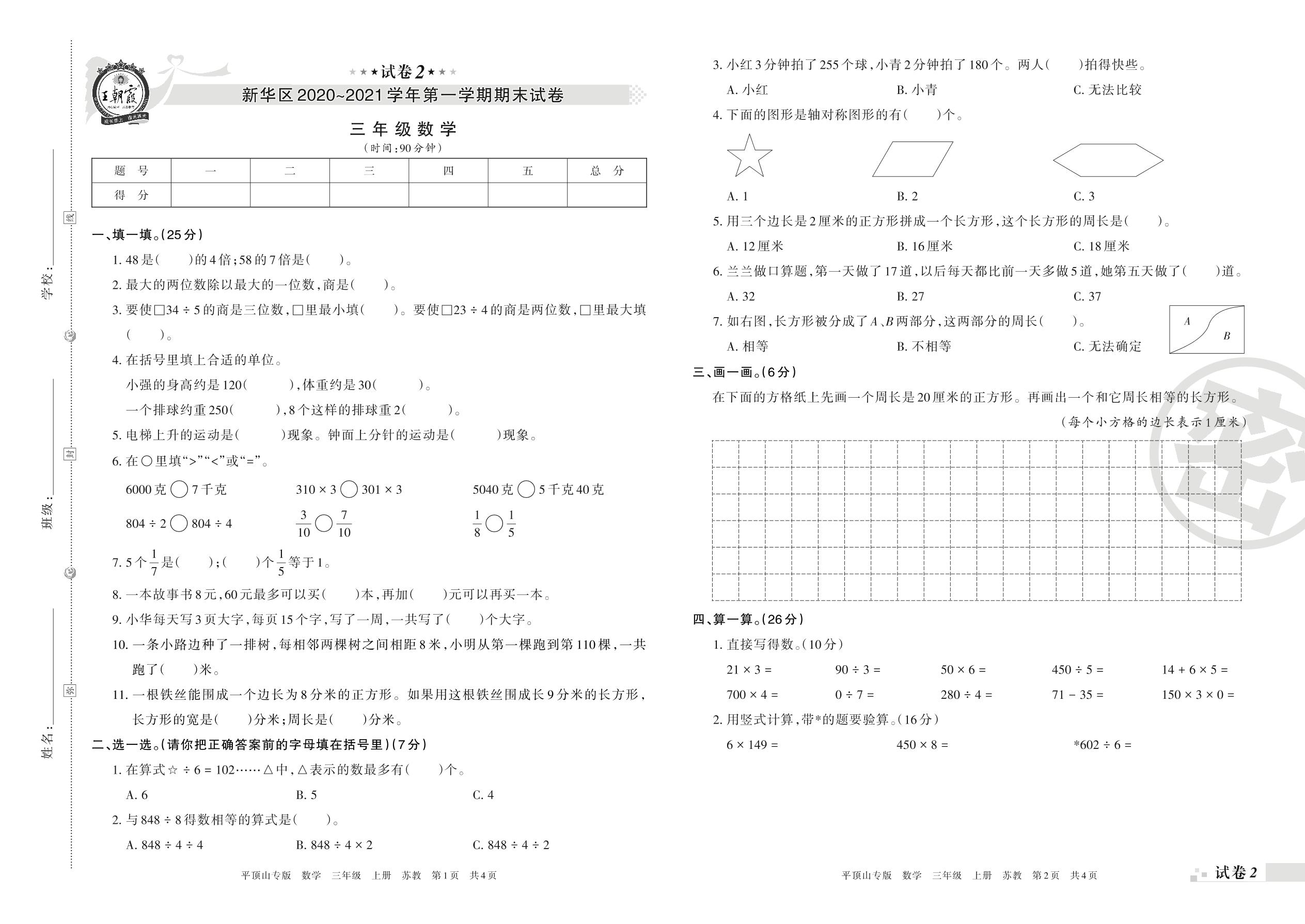 新华区2020~2021学年第一学期期末试卷三年级数学(苏教版)【2】