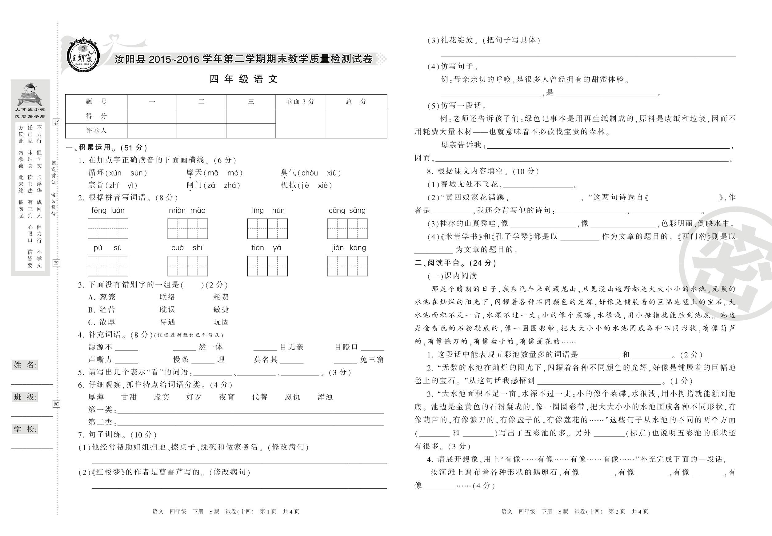 2015-2016学年第二学期洛阳市汝阳县四年级语文试卷(S版)【14】