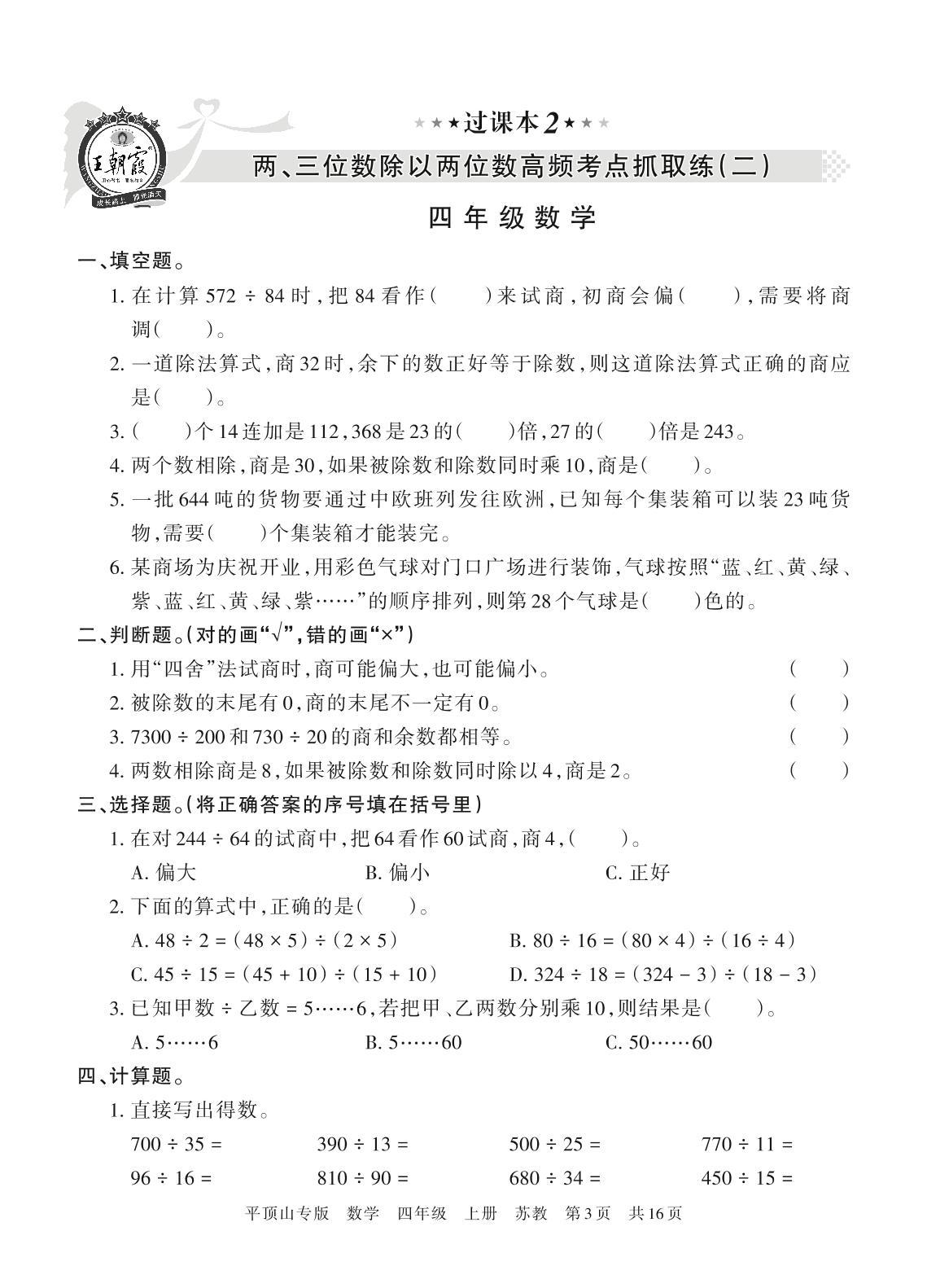 王朝霞期末过课本——两、三位数除以两位数高频考点抓取练(二)四年级上册数学(苏教版)_R211201141730328【2】