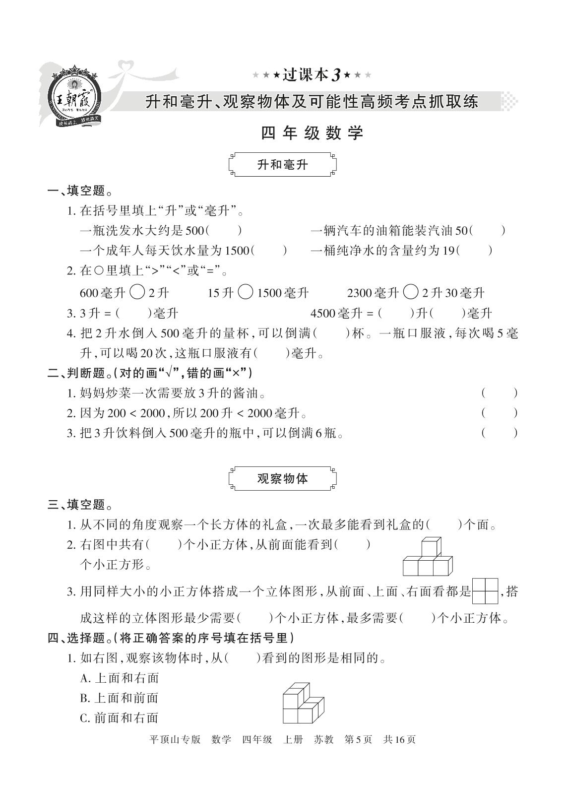 王朝霞期末过课本——升和毫升、观察物体及可能性高频考点抓取练四年级上册数学(苏教版)_R211201141730747【3】
