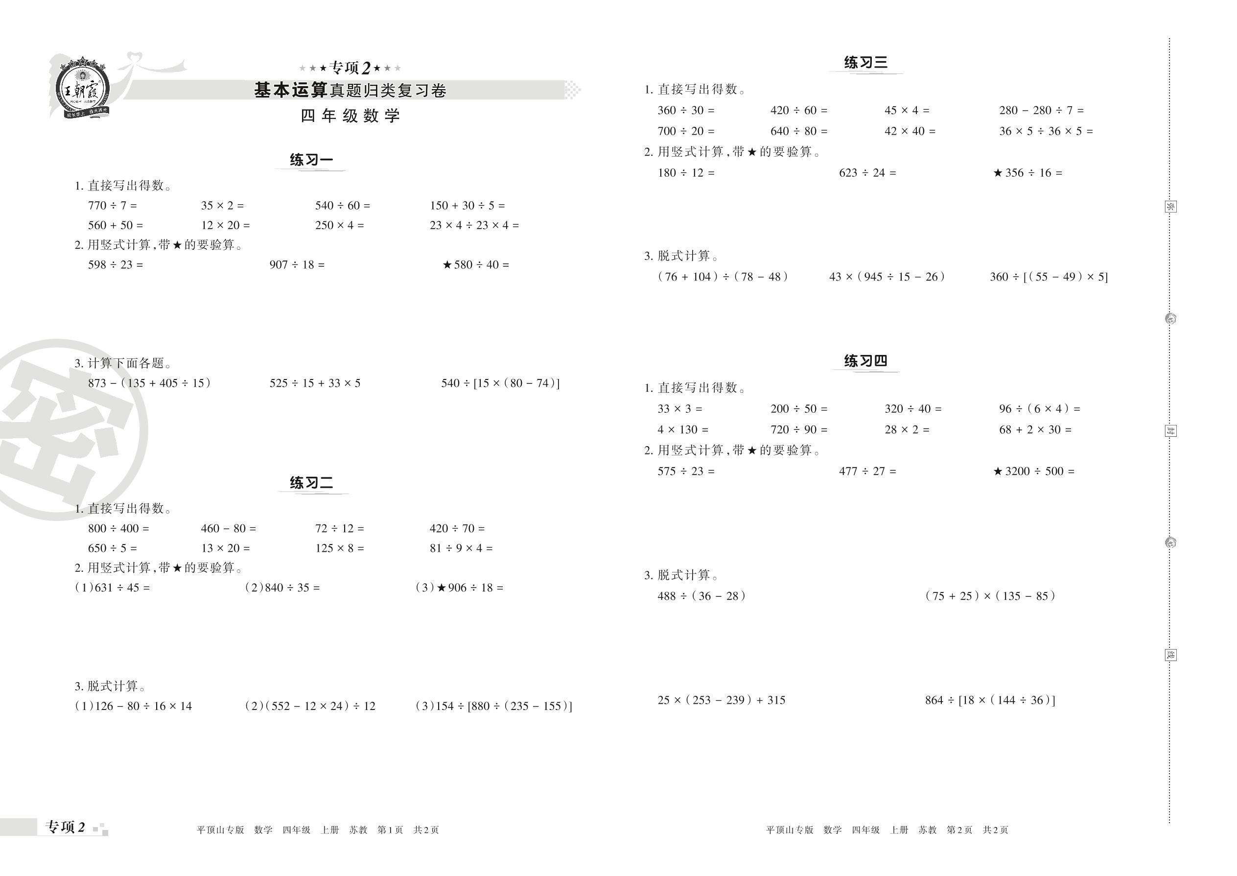 王朝霞期末专项卷——基本运算真题归类复习卷四年级上册数学(苏教版)_R211201141730364【2】