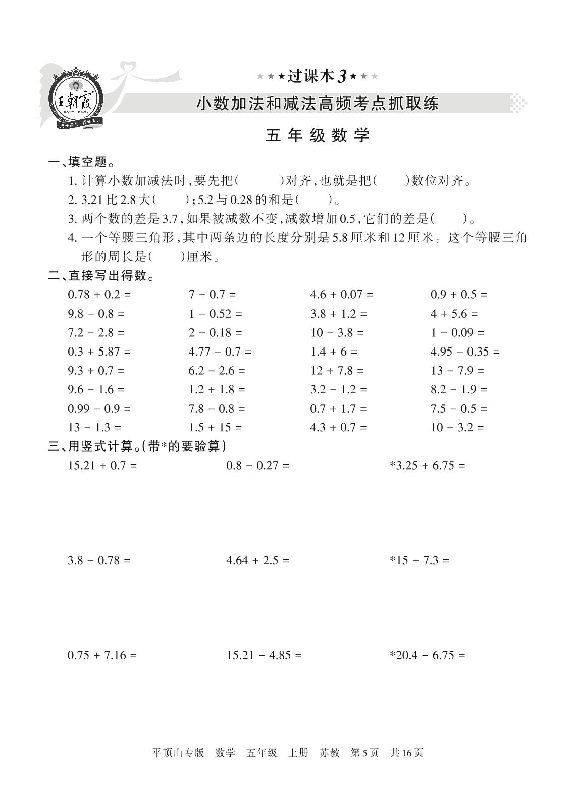 王朝霞期末过课本——小数加法和减法高频考点抓取练五年级上册数学(苏教版)_R211201142023114【3】