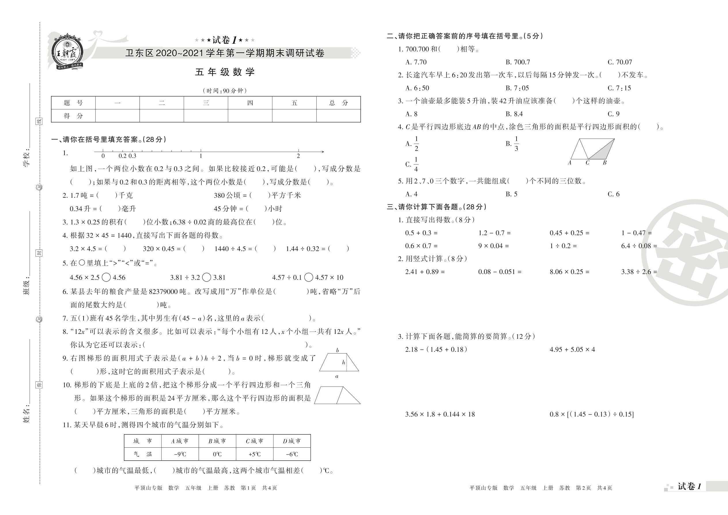 卫东区2020~2021学年第一学期期末调研试卷五年级数学(苏教版)【1】