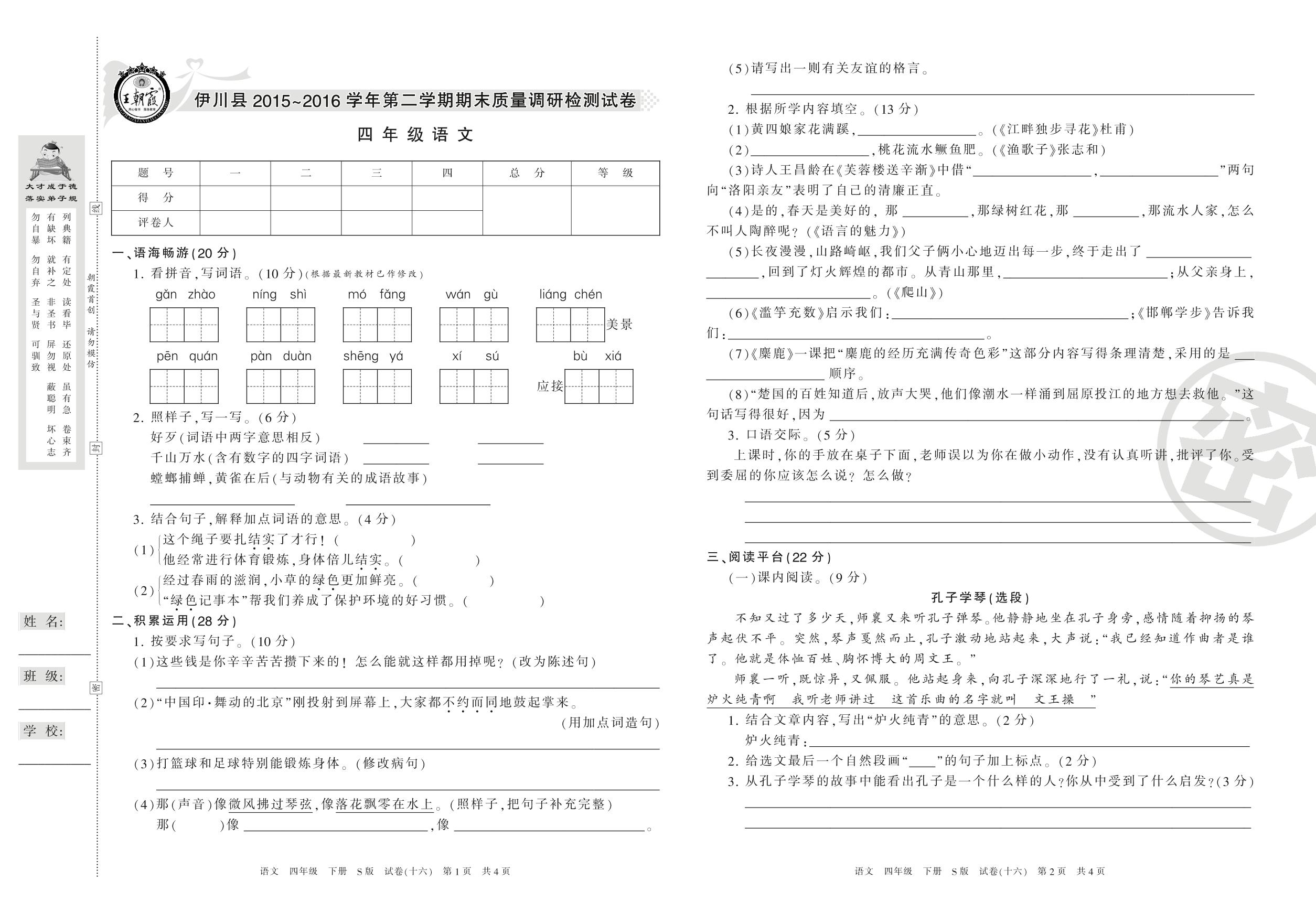2015-2016学年第二学期洛阳市伊川县四年级语文试卷(S版)【16】