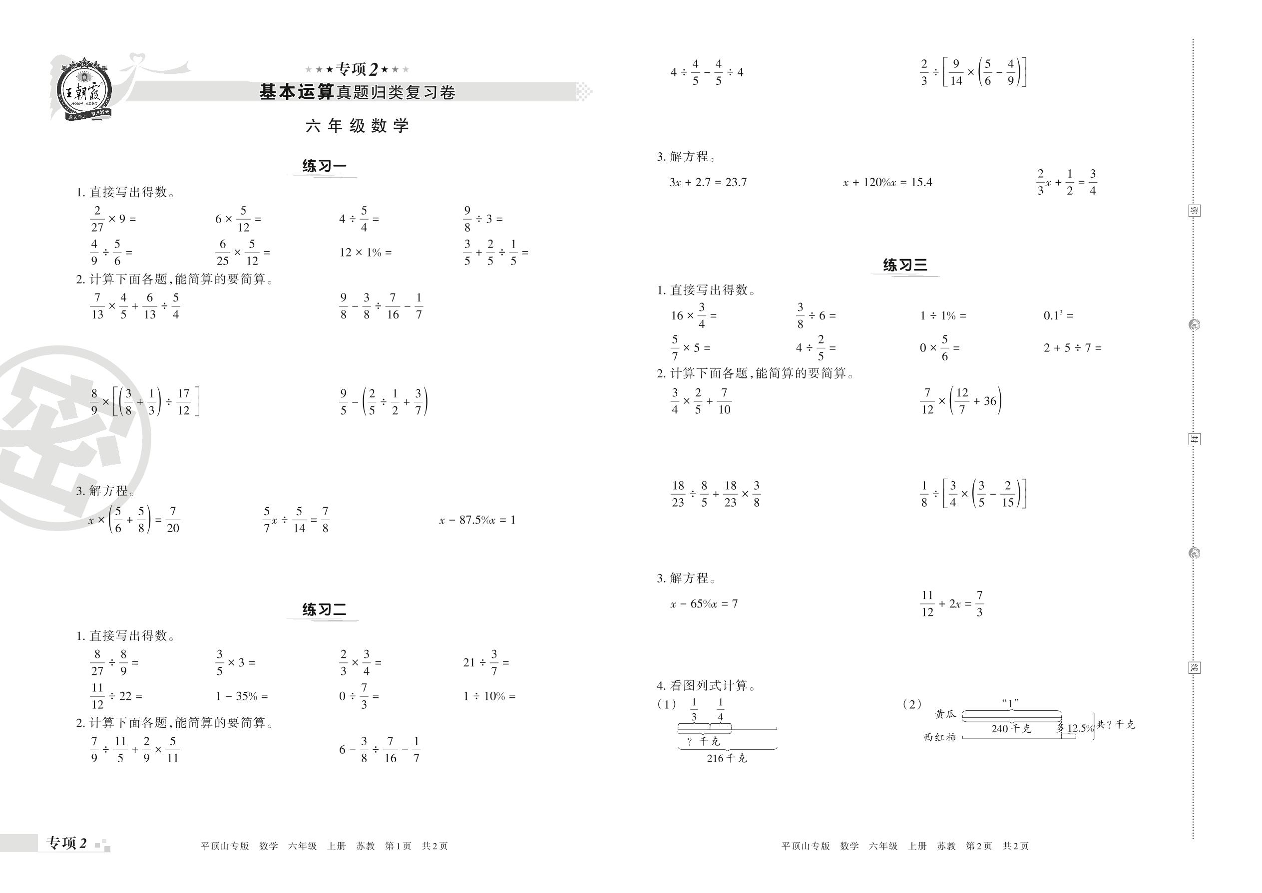 王朝霞期末专项卷——基本运算真题归类复习卷六年级上册数学(苏教版)_R211201142330196【2】