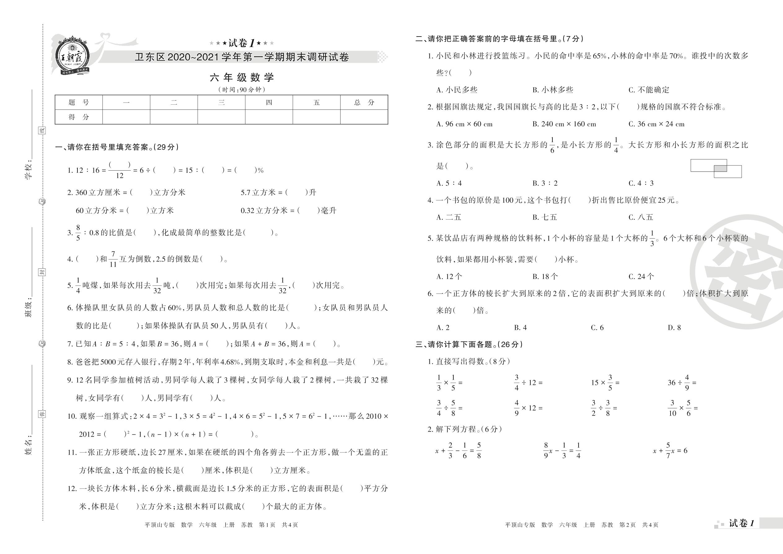 卫东区2020~2021学年第一学期期末调研试卷六年级数学(苏教版)【1】