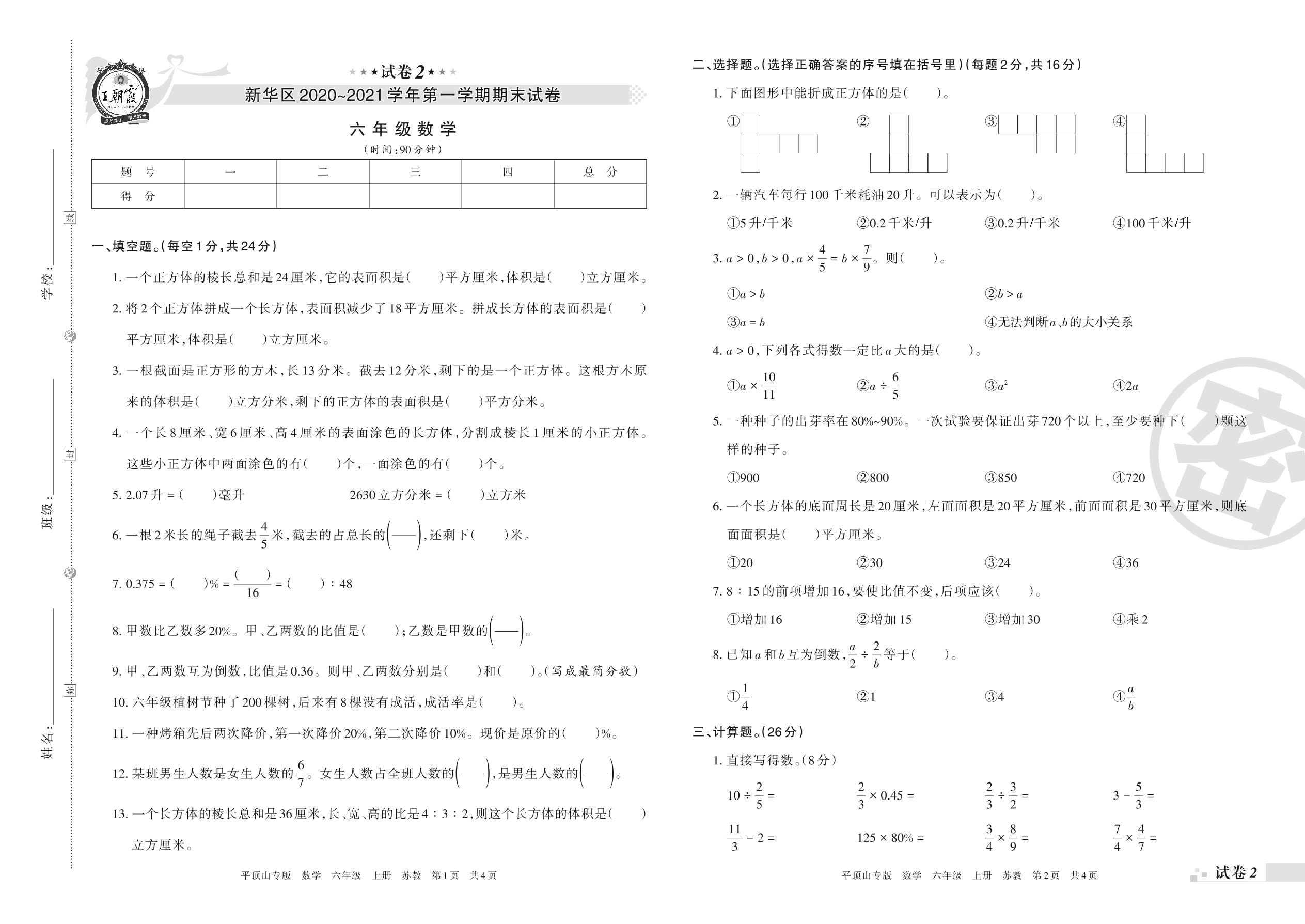 新华区2020~2021学年第一学期期末试卷六年级数学(苏教版)【2】