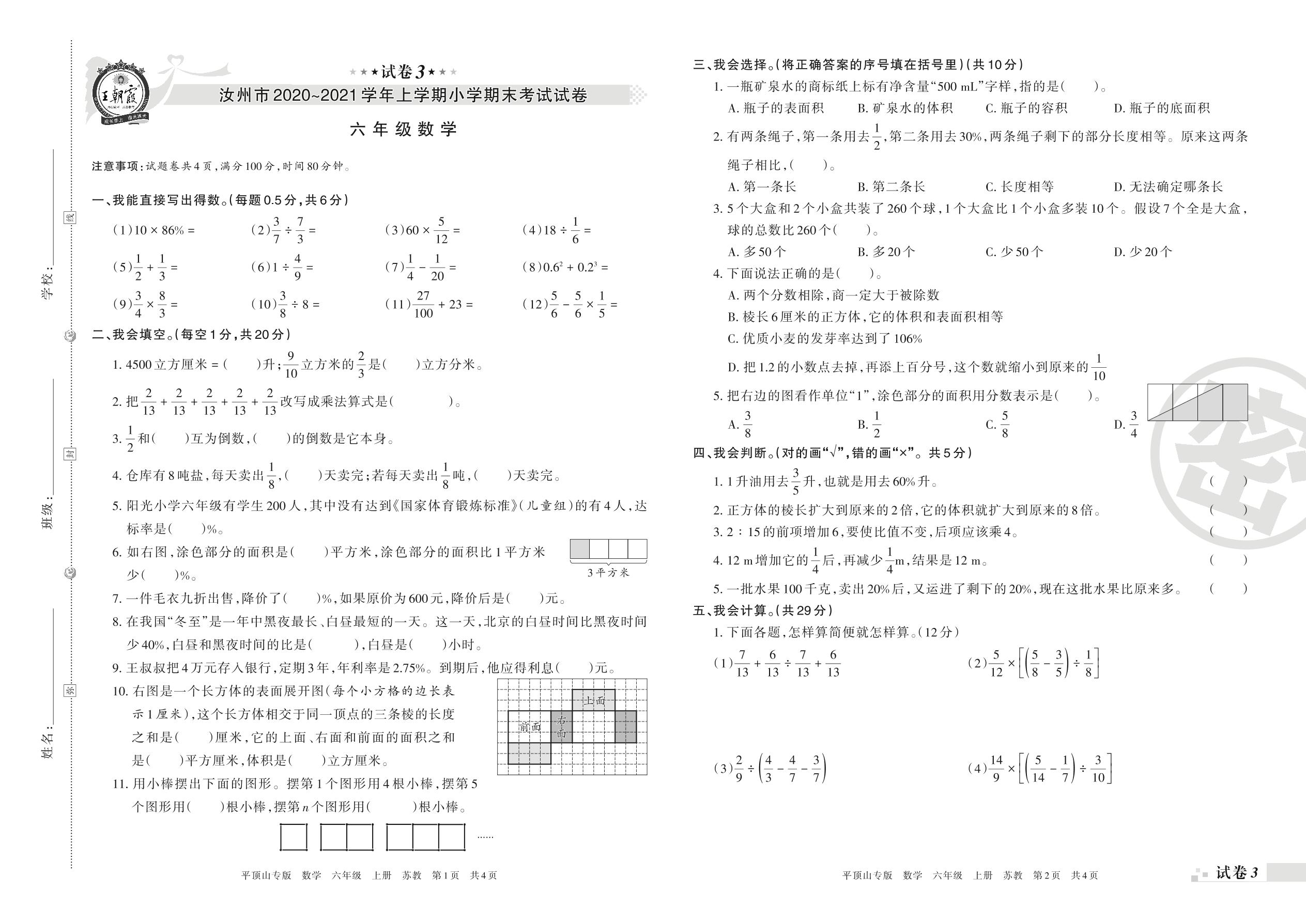 汝州市2020~2021学年上学期小学期末考试试卷六年级数学(苏教版)【3】
