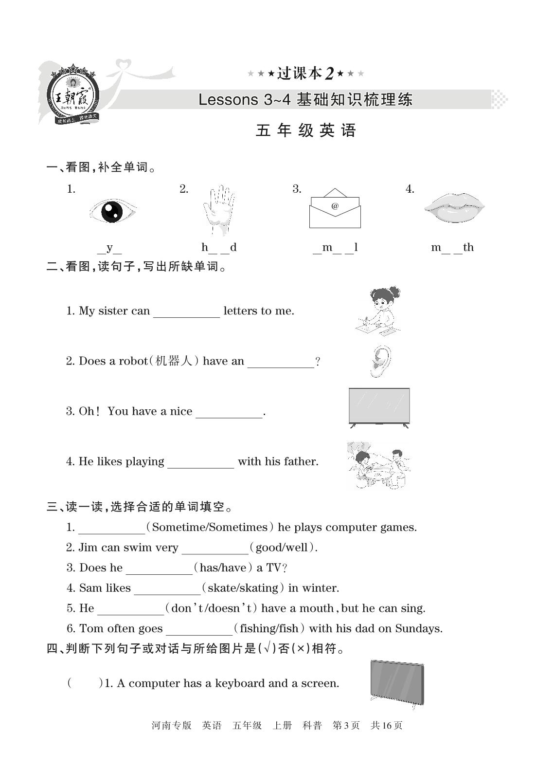 王朝霞期末过课本——Lessons 3~4 基础知识梳理练五年级上册英语(科普版)【2】