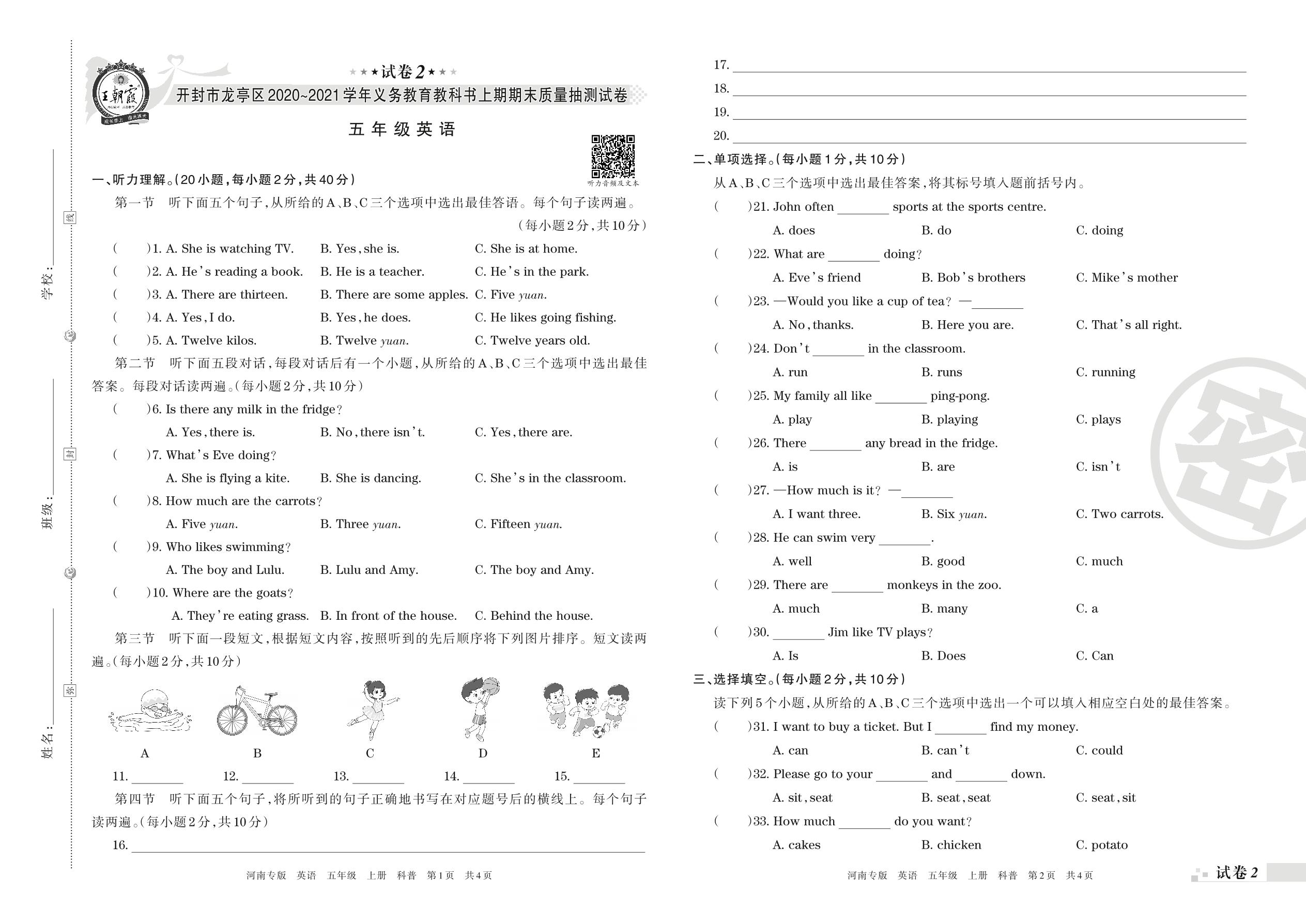开封市龙亭区2020~2021学年义务教育教科书上期期末质量抽测试卷五年级英语(科普版)【2】