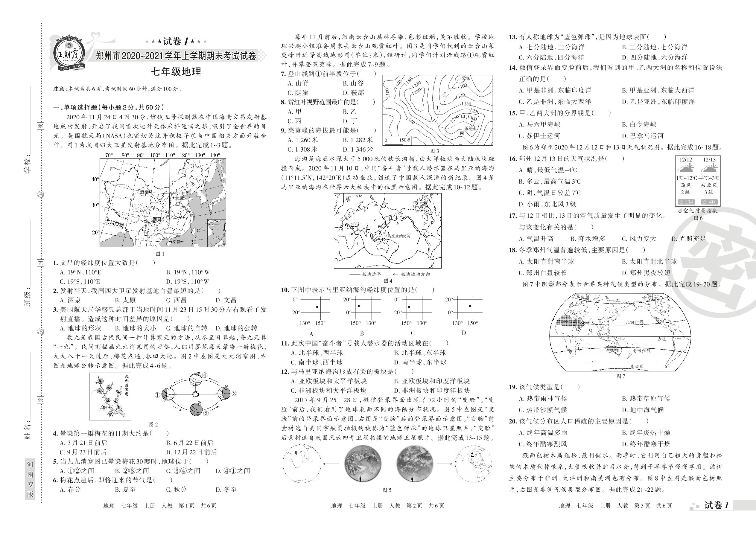 郑州市2020~2021学年上学期期末考试试卷七年级地理(人教版)【1】